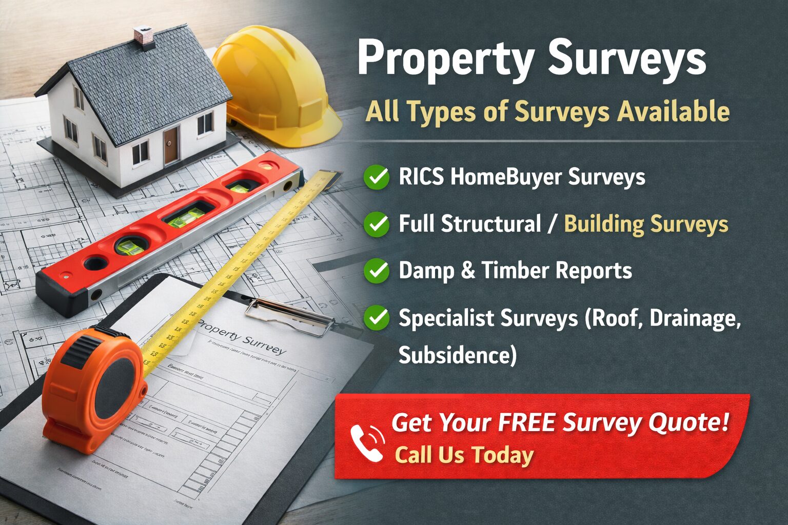 We can organise a wide range of professional property surveys through qualified surveyors to help identify any potential issues before or after purchase.