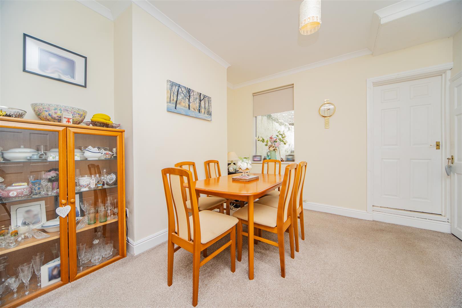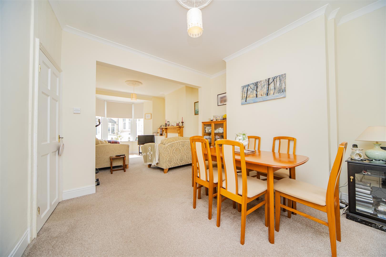 The entrance hall leads into an open-plan living and dining area, offering ample space for everyday living. The bay window allows plenty of natural light, and there is functional under-stairs storage.