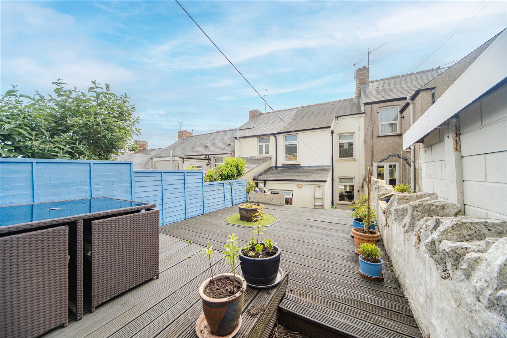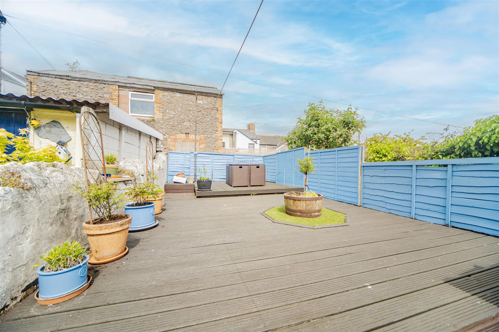 Externally, the rear garden is tiered and designed for low maintenance. It offers a patio area and steps leading up to a raised decking space, suitable for seating or outdoor use.