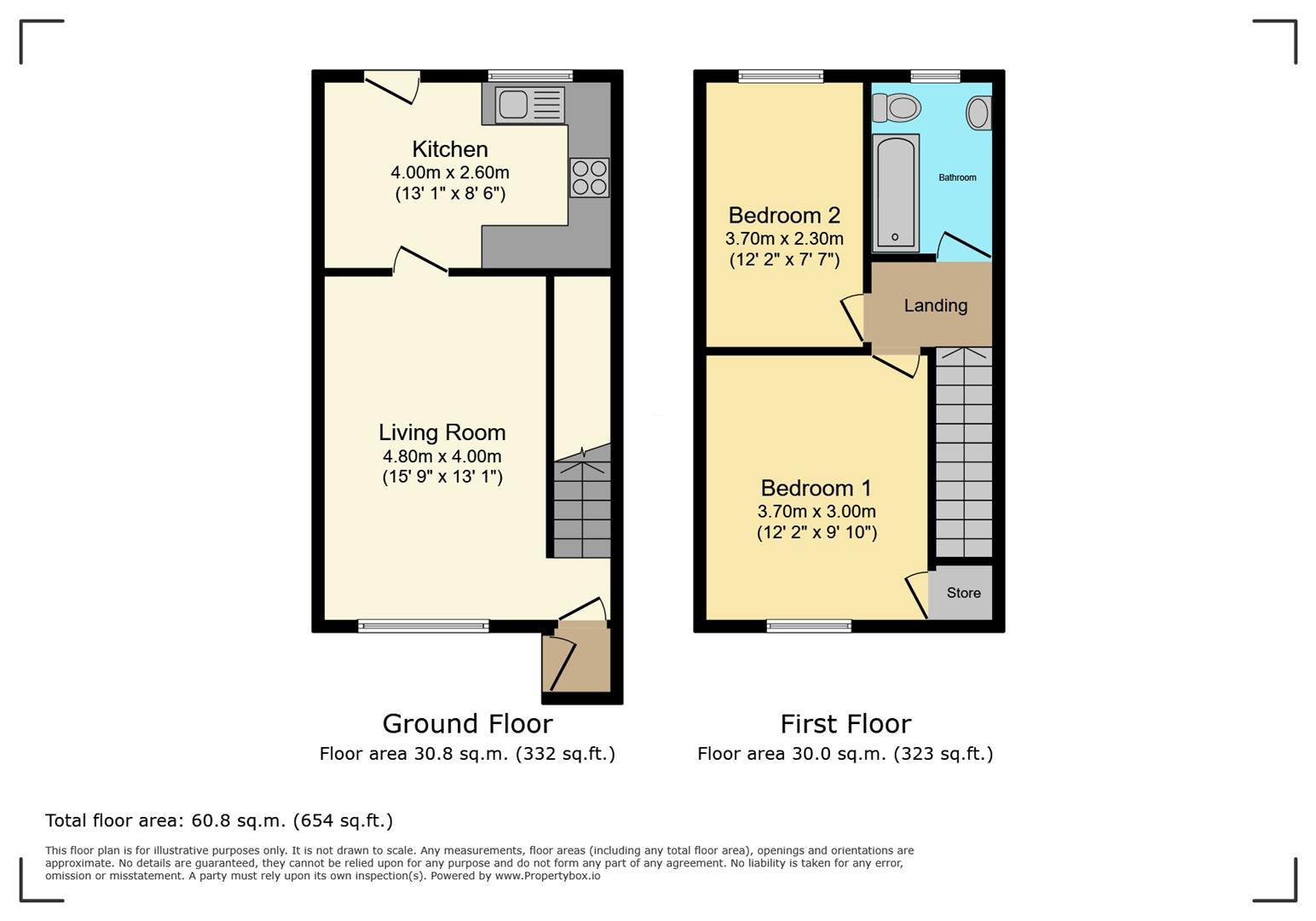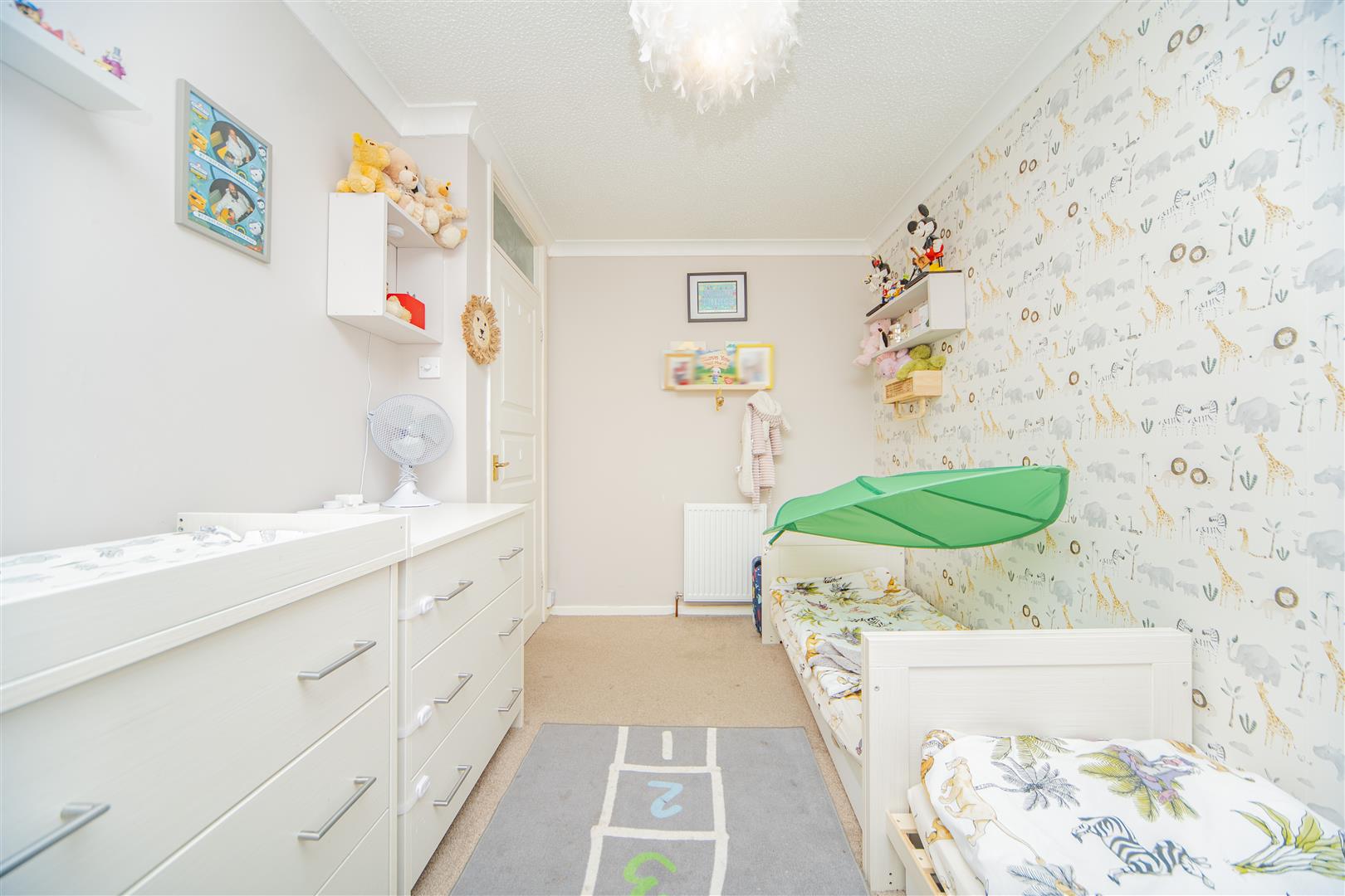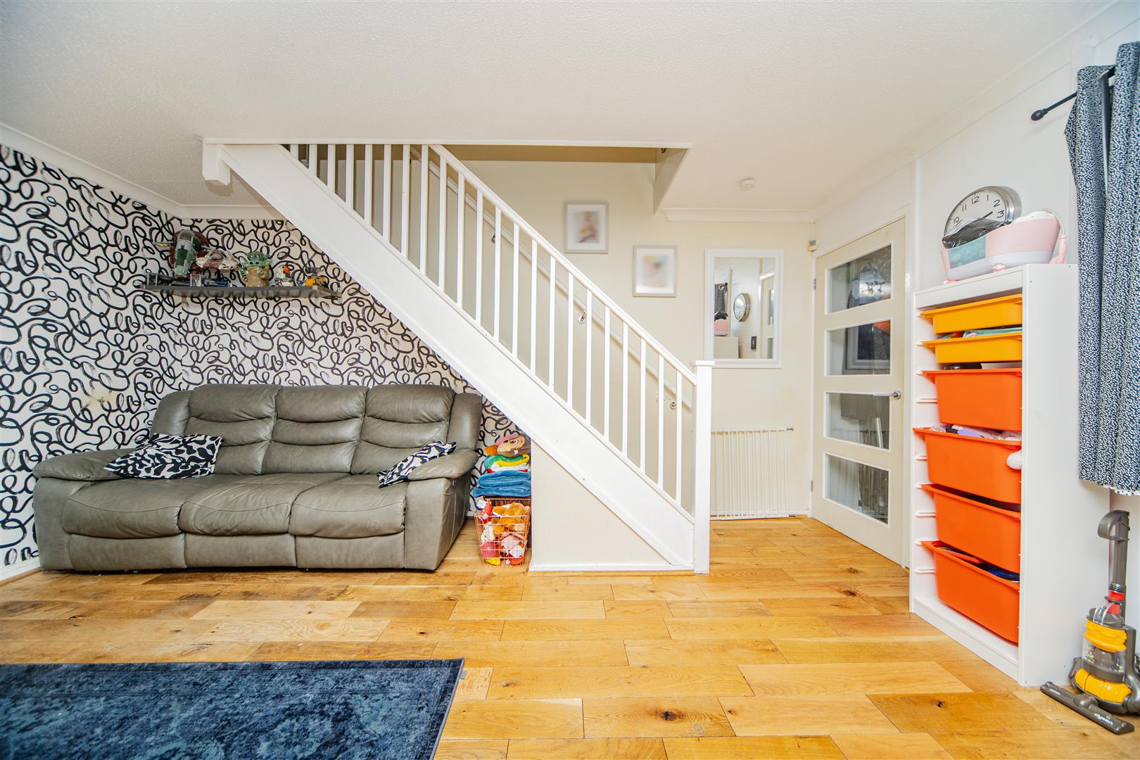 Upstairs, the property features two well-proportioned bedrooms, each offering a comfortable and peaceful retreat. The family bathroom is fitted with a white suite comprising a toilet, sink, and bath, with the added convenience of a shower over the bath. The wood-effect flooring and white wall tiles create a clean and contemporary finish.