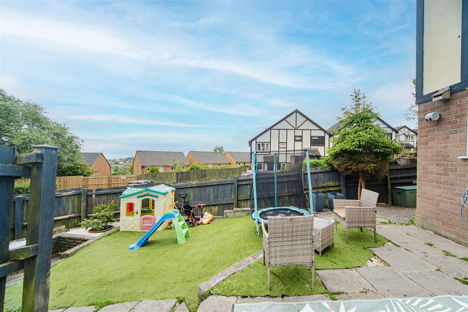 The rear garden is a delightful space, ideal for relaxing or entertaining. A paved patio area offers the perfect spot for outdoor seating, leading down to a well-maintained lawn. The garden also benefits from a shed for additional storage and rear access.