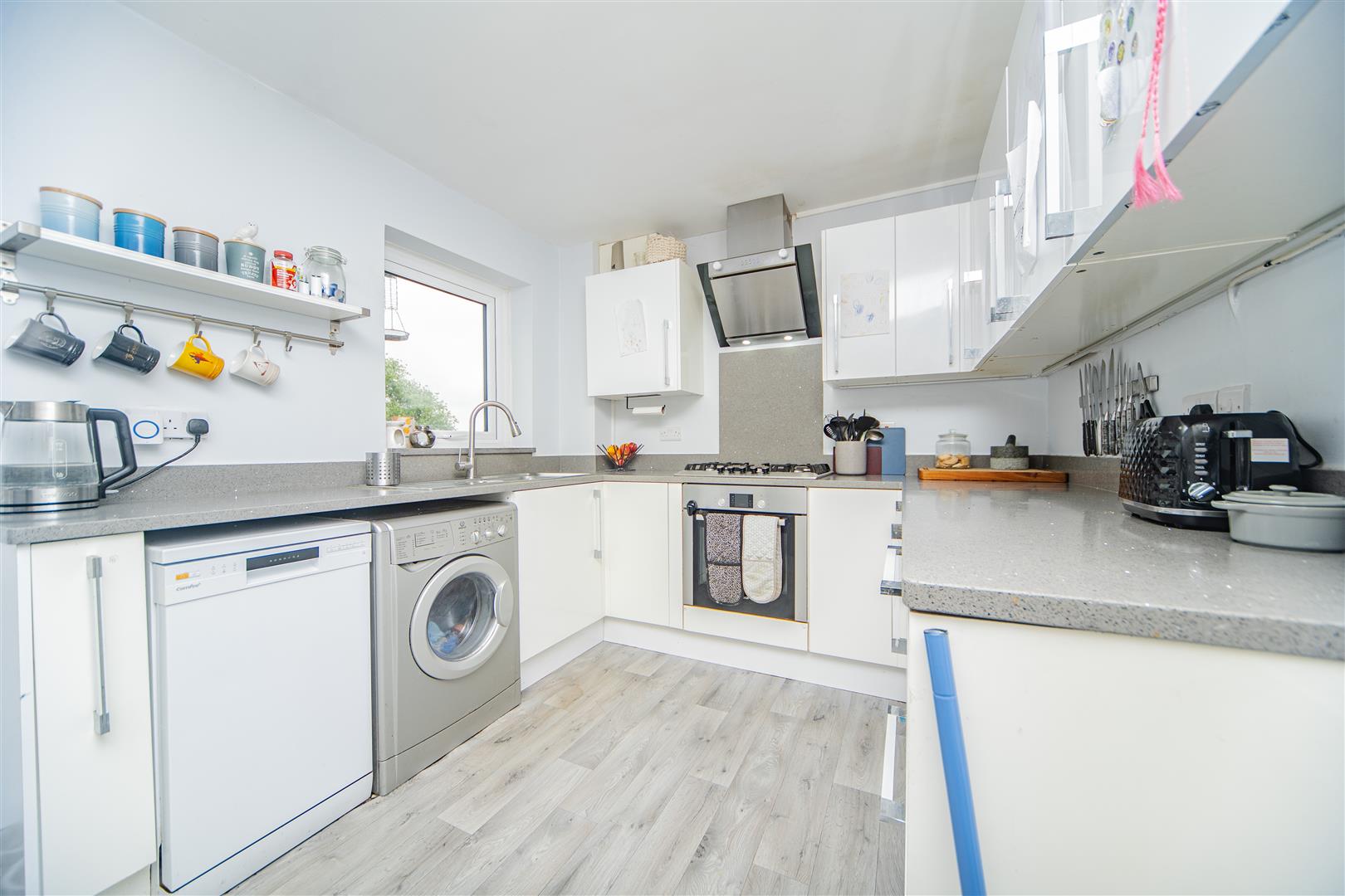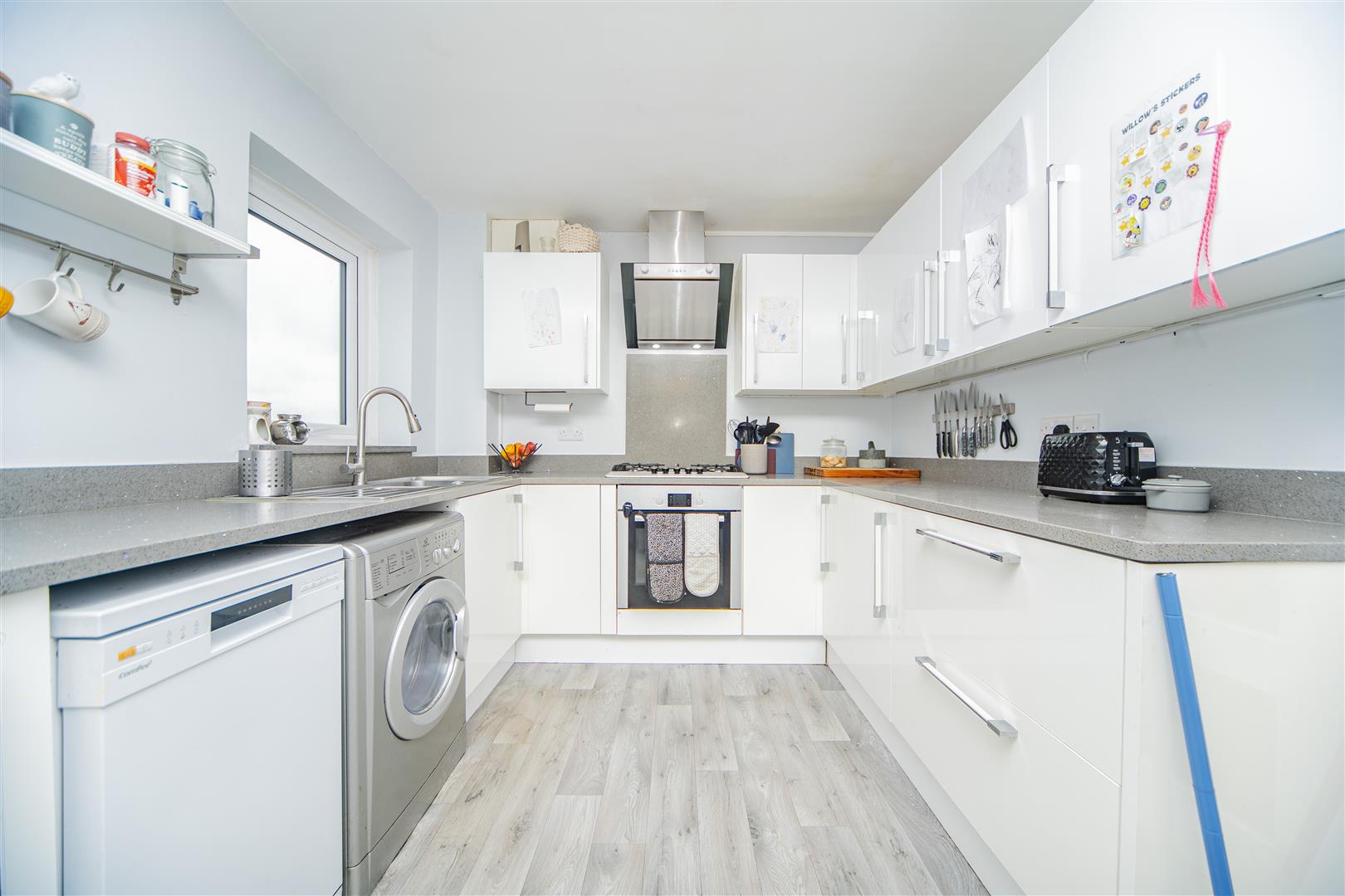 The kitchen/diner is situated at the rear of the property and has been finished to a high standard, featuring sleek white high-gloss cupboards complemented by grey worktops. There is ample storage and preparation space, along with grey wood-effect flooring. The room comfortably accommodates a dining table, making it a great space for everyday living and entertaining. From here, you also have direct access to the rear garden.