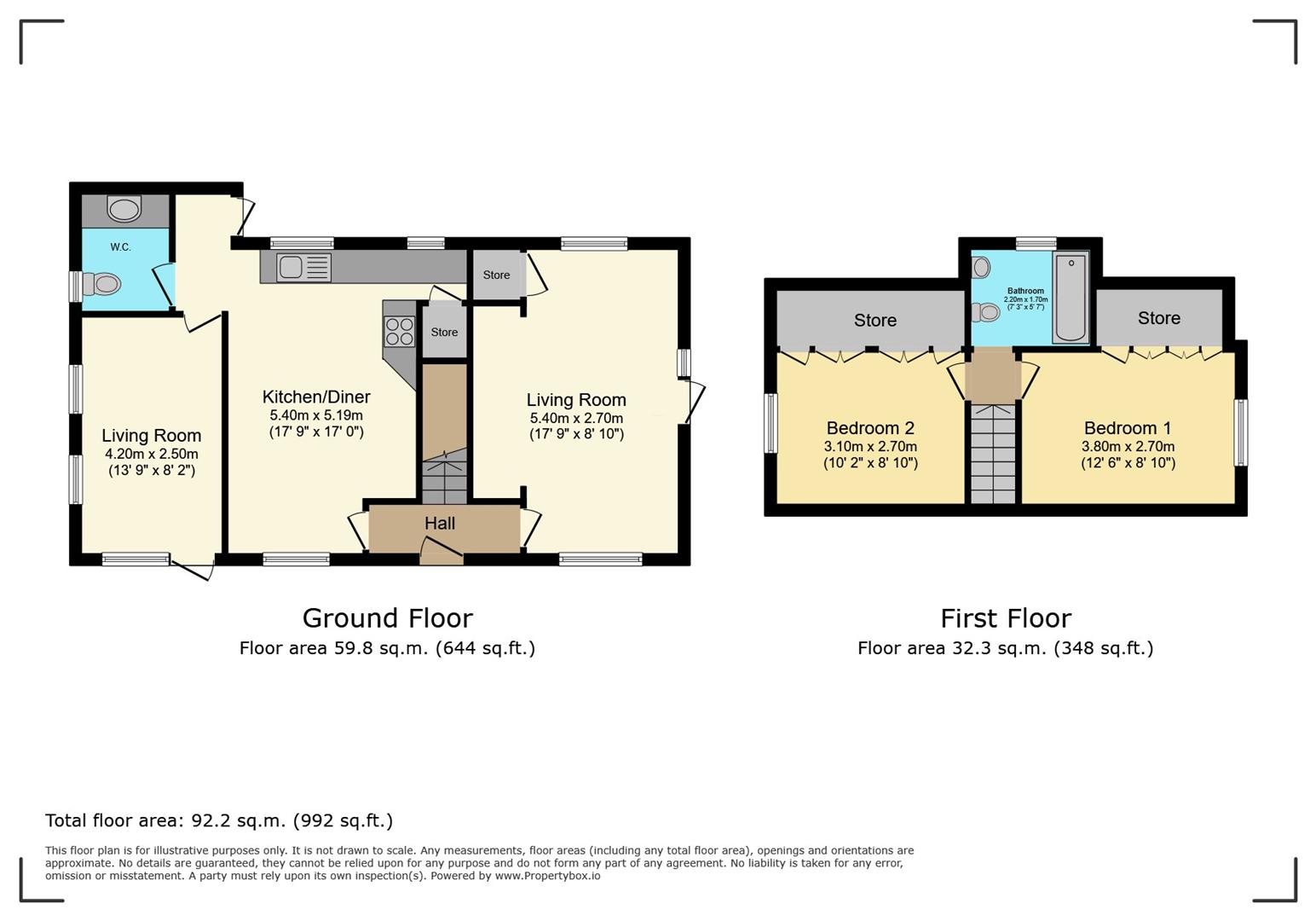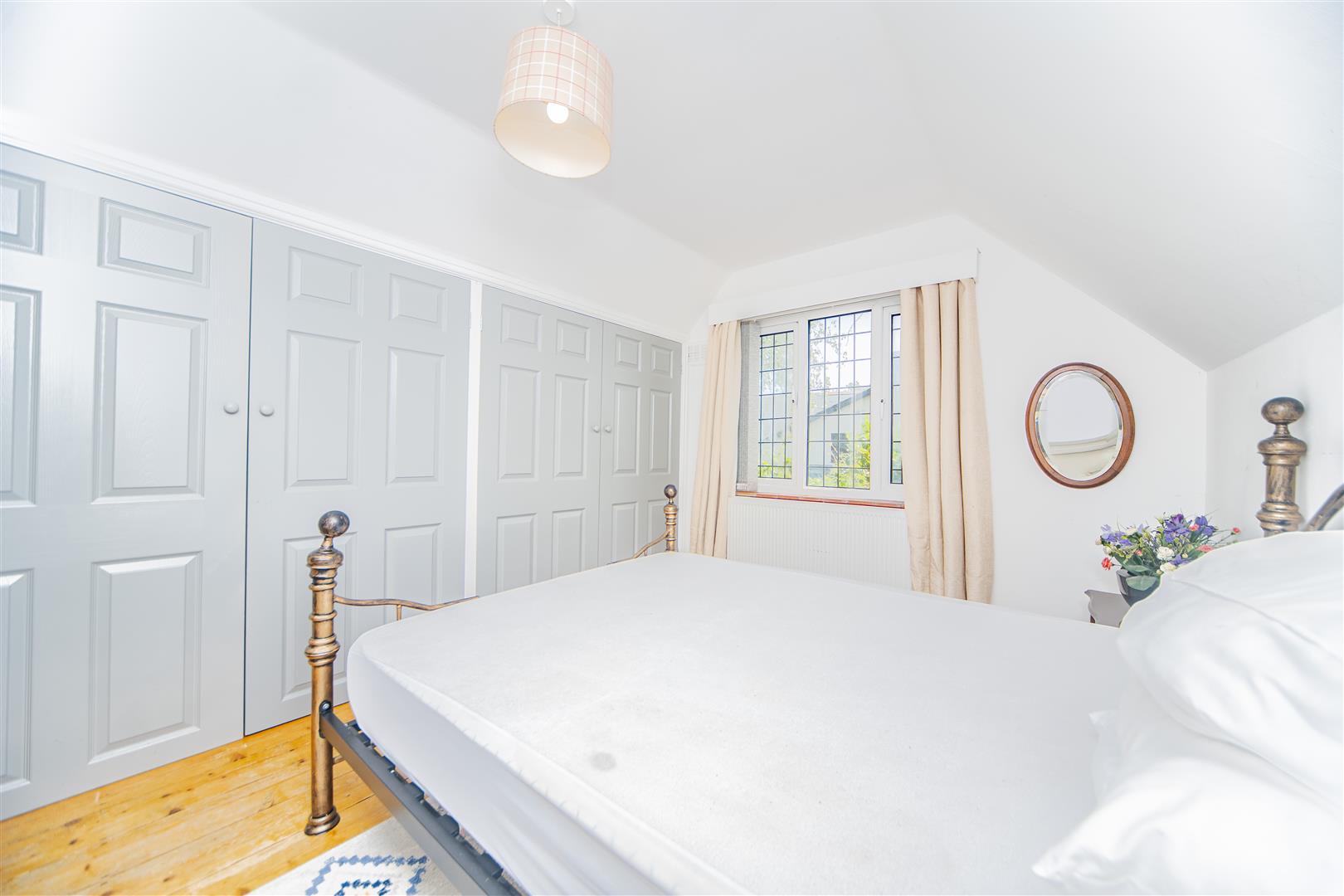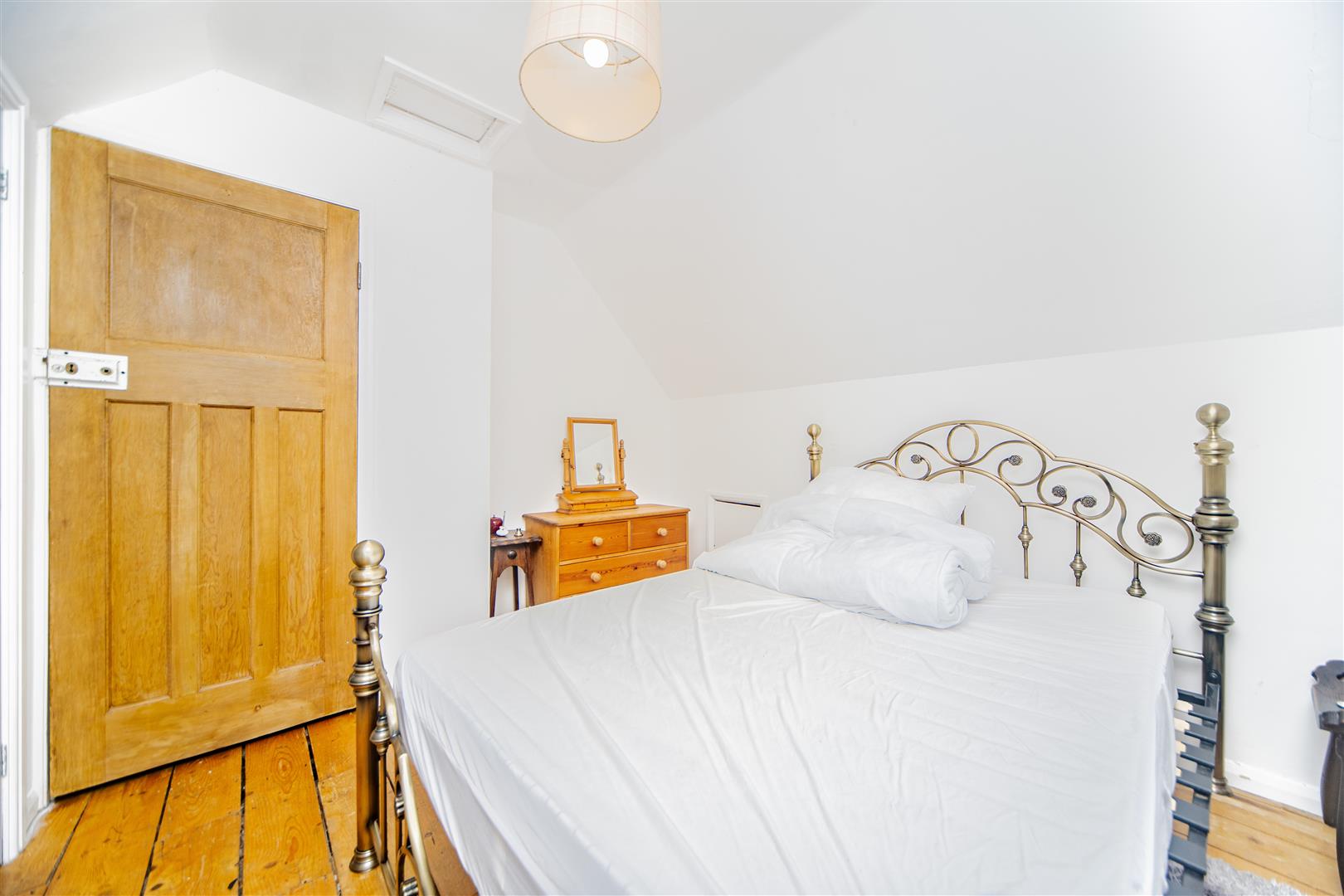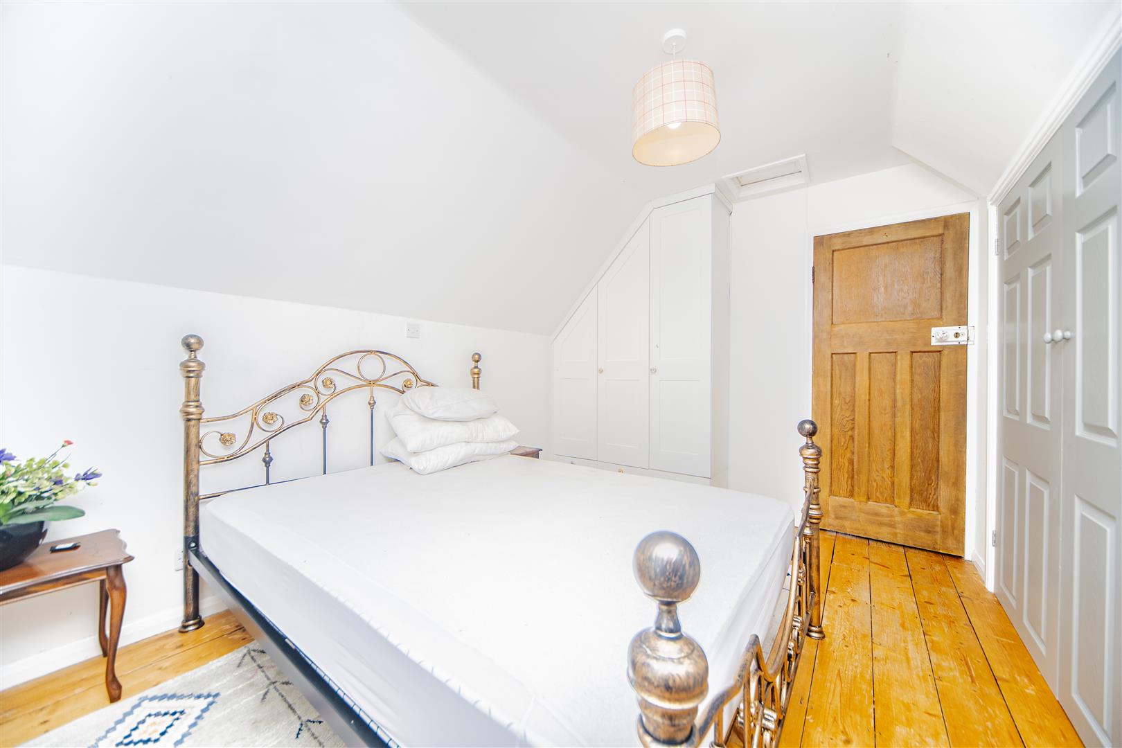 Upstairs, you’ll find two spacious double bedrooms, both finished with original wooden flooring and built-in storage. The family bathroom is neutrally styled, featuring a white bath and shower unit, a matching sink and toilet, and the same beautiful wood flooring throughout.