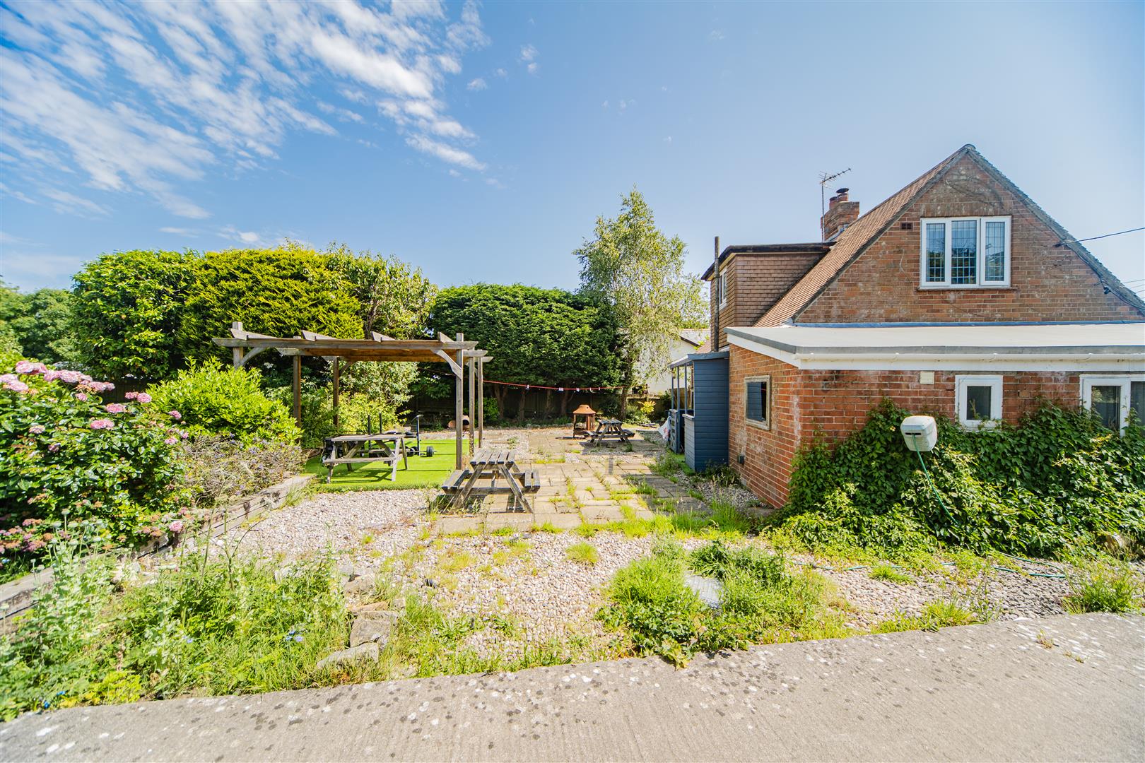 Set back from the road with a landscaped front garden and generous off-street parking, the property makes a strong first impression. Upon entering, you're welcomed into a bright and inviting entrance hall. The first reception room is full of charm, featuring a striking exposed brick fireplace, original wooden beams, and dual-aspect windows that flood the space with natural light. Patio doors open out to the side garden, and a built-in storage cupboard adds practicality.