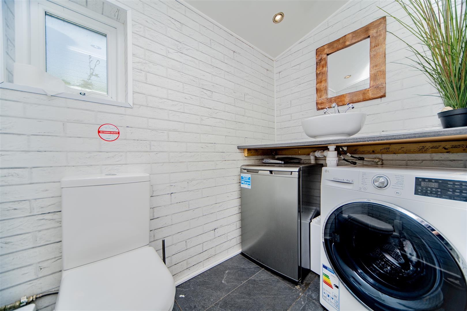 The kitchen/diner exudes a classic cottage feel with its wooden cabinetry and worktops, complemented by dark slate-tiled flooring throughout. A feature brick fireplace with a log burner adds warmth to the dining area, which easily accommodates a large dining table perfect for gatherings. There is also access to an under-stairs storage cupboard, the rear garden, and a downstairs toilet/utility room.