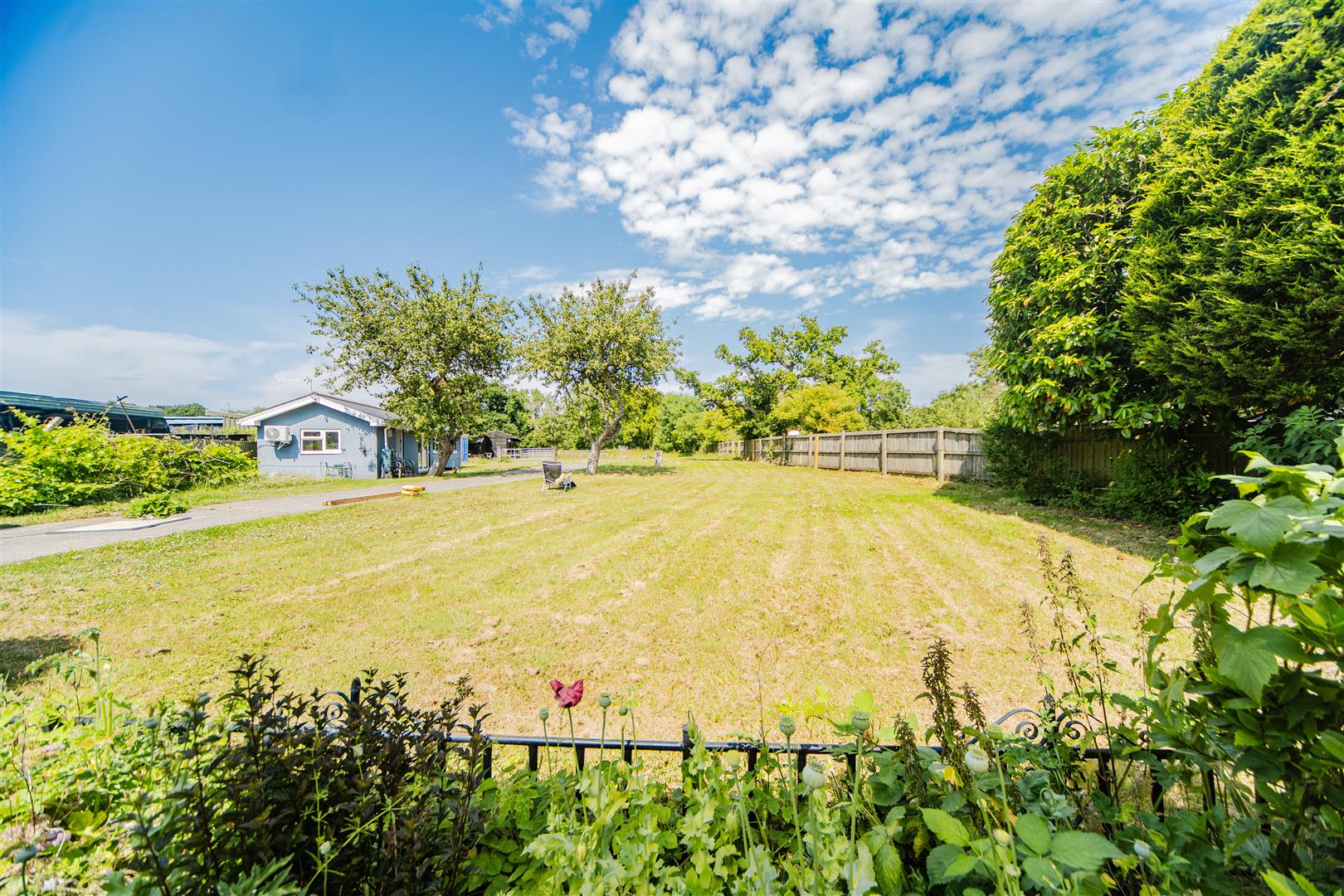 The rear garden is a true highlight, comprising approximately 1.5 acres of beautifully maintained outdoor space, including patio areas perfect for entertaining, stables, a storage shed, and a large lawned section that offers privacy and potential.