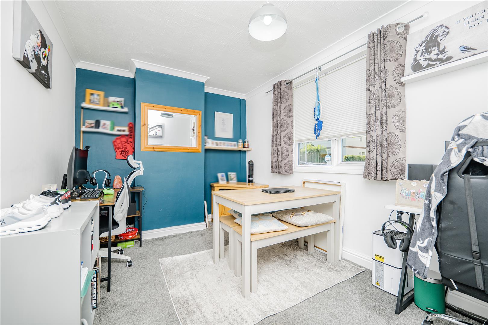 Upon entering, you are welcomed into the entrance hall, which provides access to the main living areas. To the front, the generous living room features a bay window that floods the space with natural light, creating a warm and inviting atmosphere. A second reception room, currently utilised as a dining room/office, offers excellent flexibility and ample space for family dining or a home workspace.