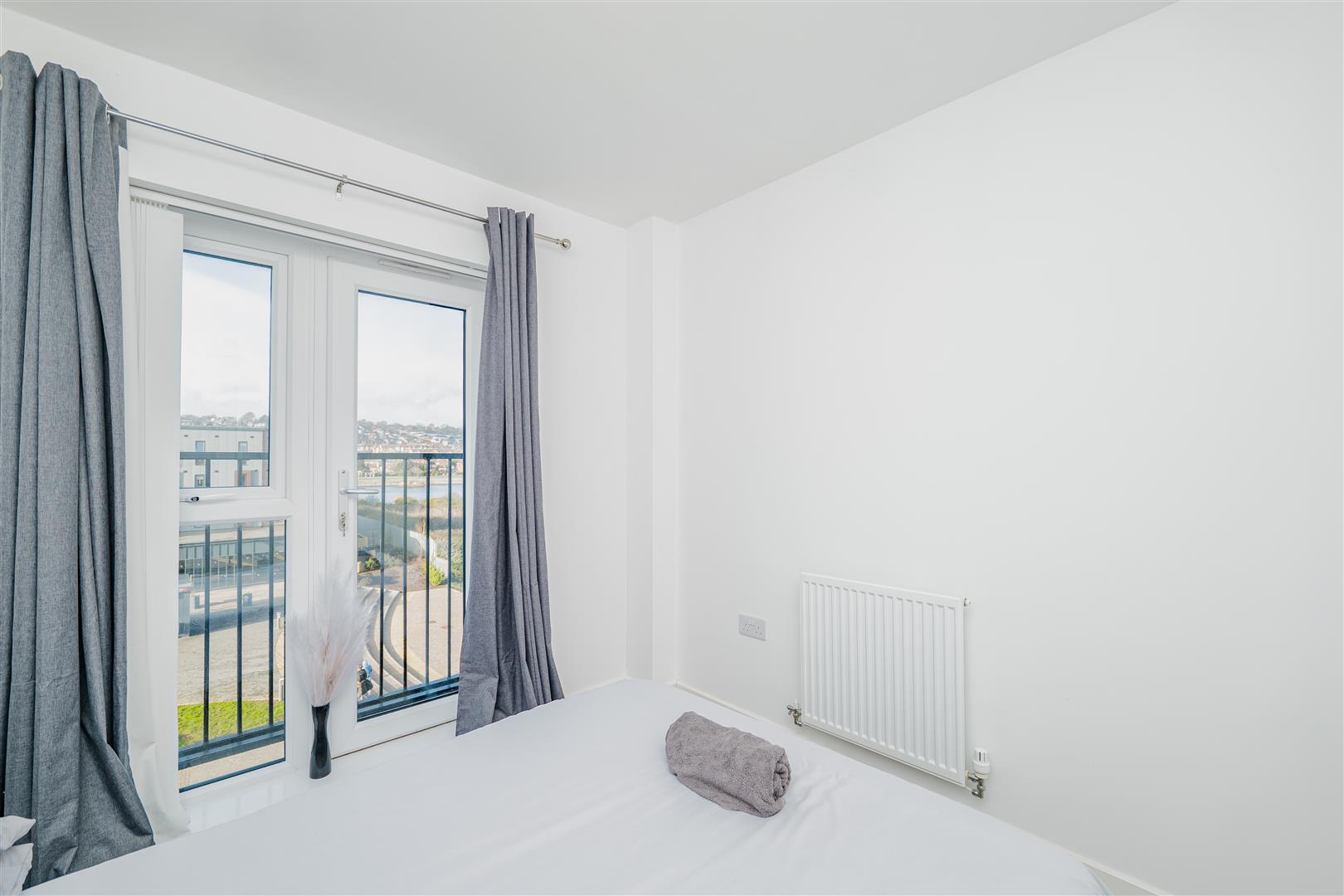 The apartment offers two generously sized bedrooms. The main bedroom features its own Juliet balcony and a modern en-suite shower room, offering a comfortable private retreat. The second bedroom is also well-proportioned and versatile, suitable as a guest room, home office or dressing room.