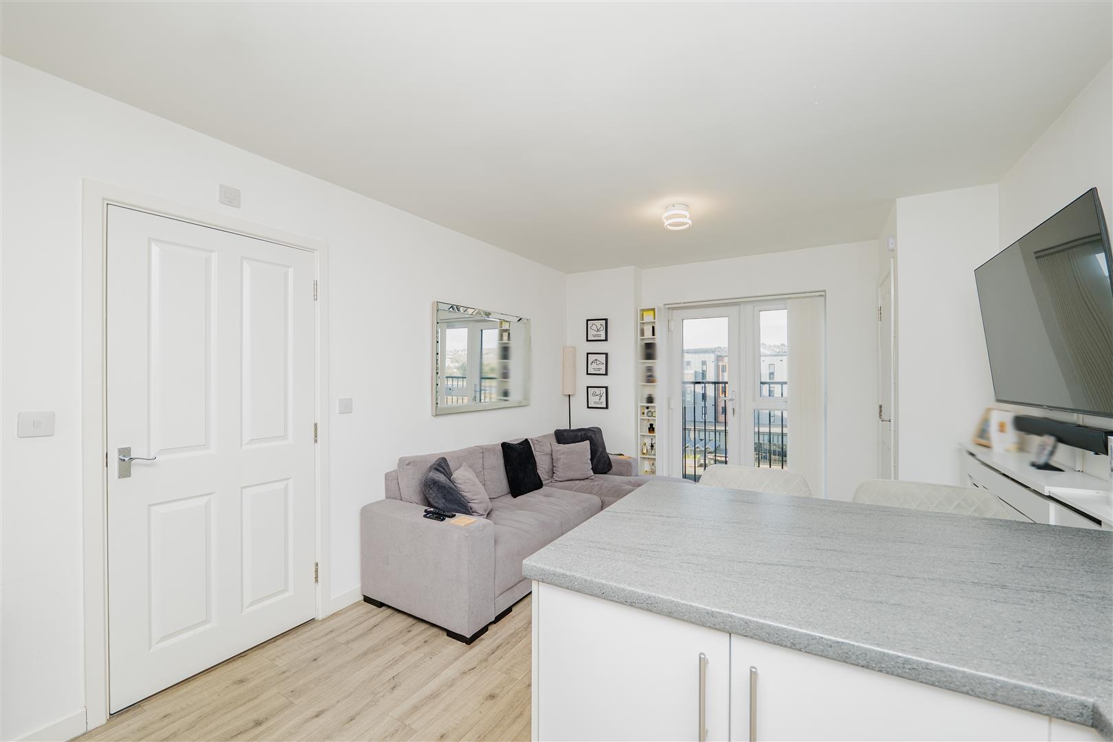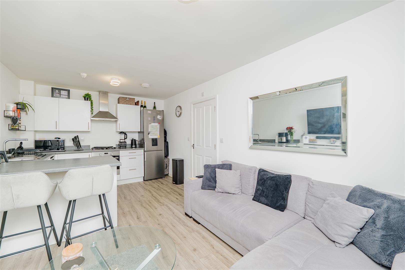 Ffordd Penrhyn, CF62 5DH, situated in a convenient coastal location within Barry, this well-presented top-floor two-bedroom apartment offers modern living just a short walk from Barry Island, making it ideal for first-time buyers, downsizers or investors alike.Upon entering, you are welcomed by an entrance hallway with a useful storage cupboard, leading through to a stunning open-plan kitchen, dining and living area. The contemporary kitchen features white cabinetry complemented by grey worktops and a breakfast bar with space for two bar stools, creating a sociable setting for everyday living. There is ample room for a sofa and coffee table, while patio doors let in plenty of natural light and open onto a Juliet balcony.