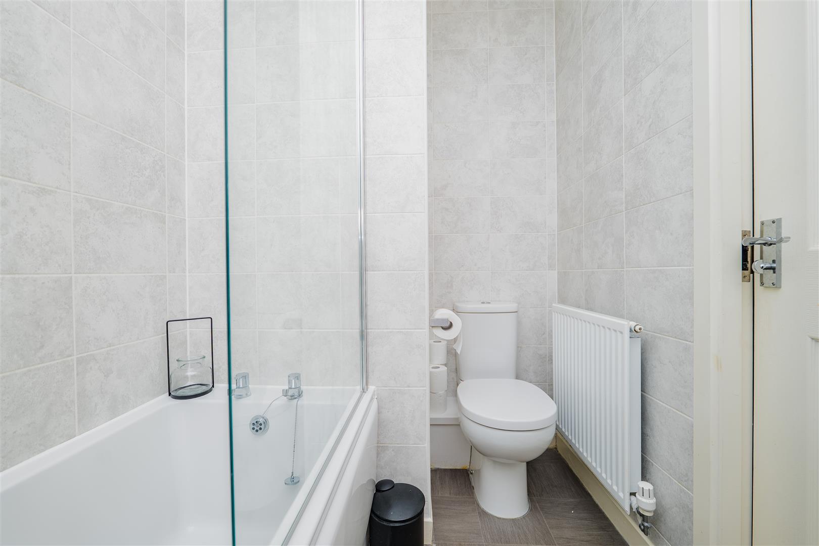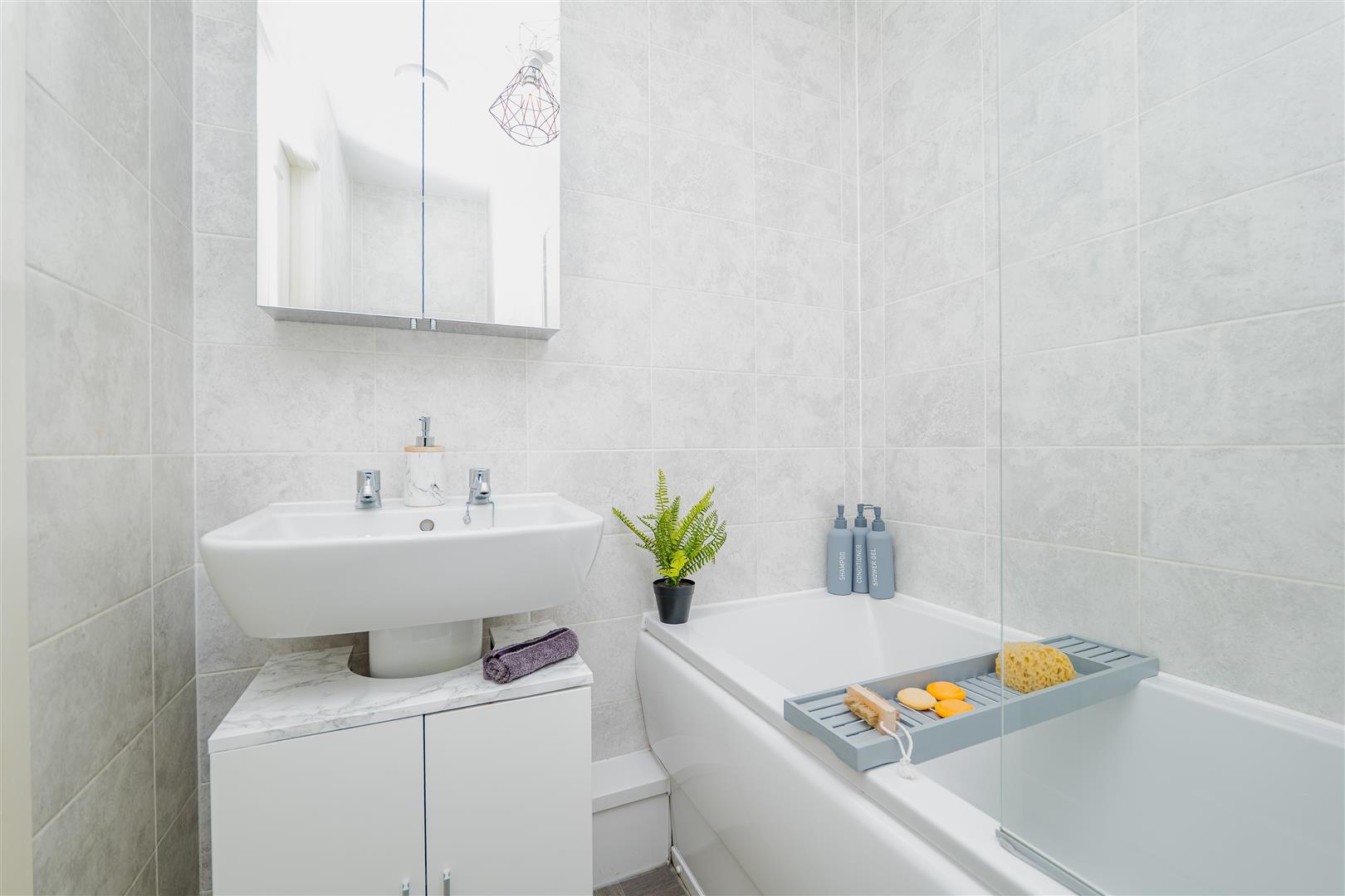 A family bathroom serves the property and comprises a bath with an overhead shower, a white WC and a wash hand basin, finished in a clean, contemporary style. Throughout the apartment, you will find neutral décor, white walls, wooden-effect flooring in the main living areas and soft grey carpeting in the one bedroom.