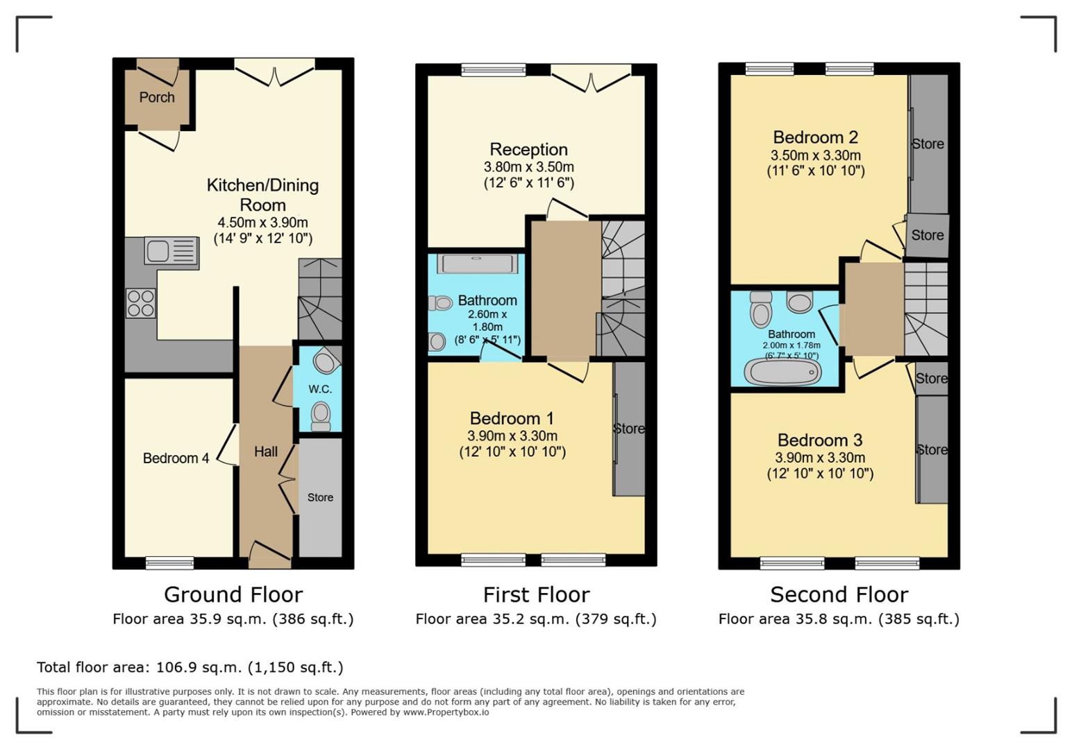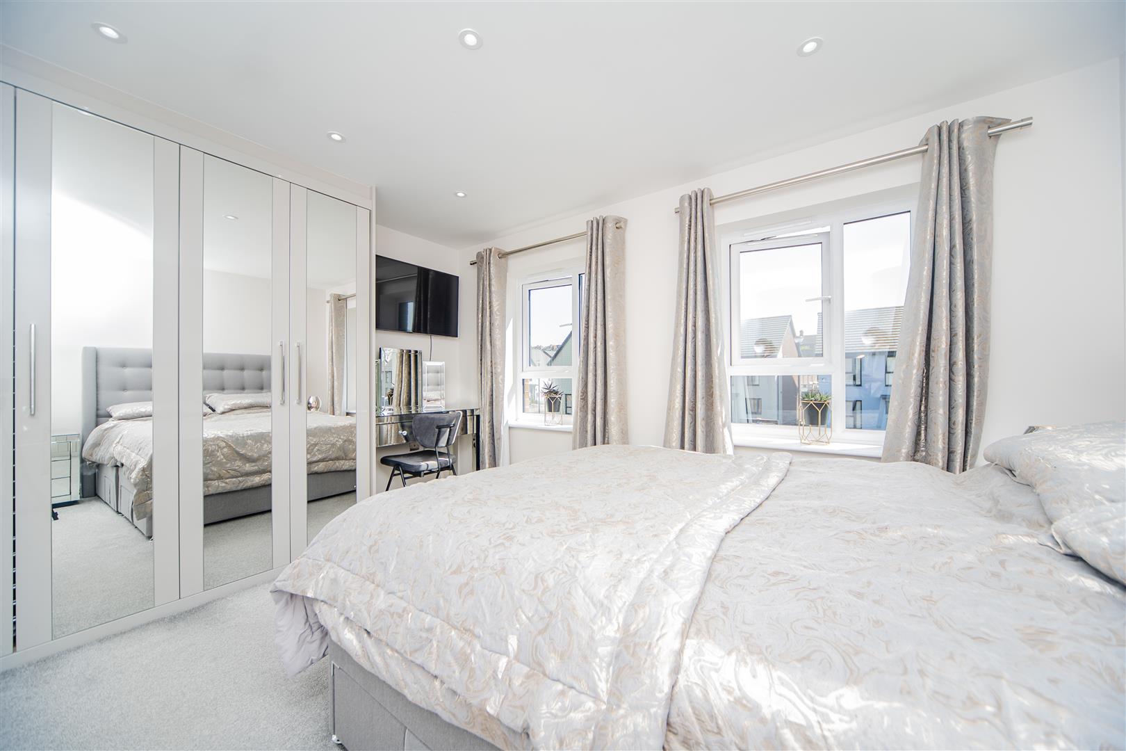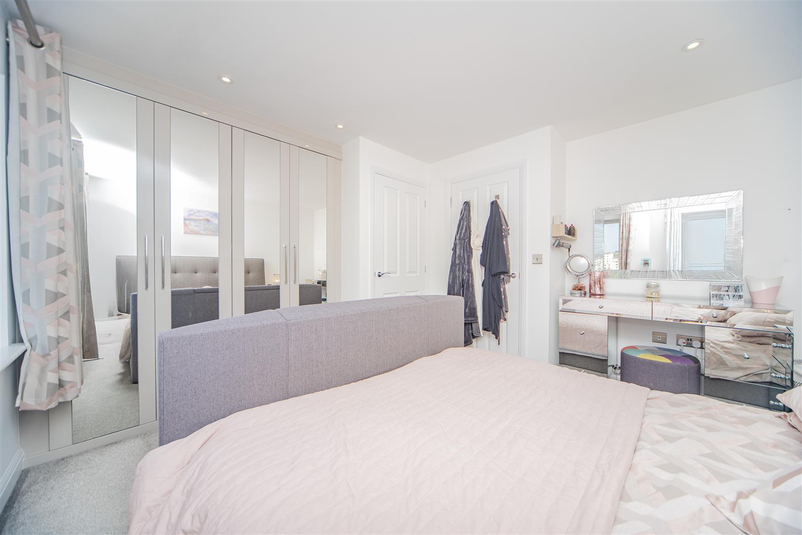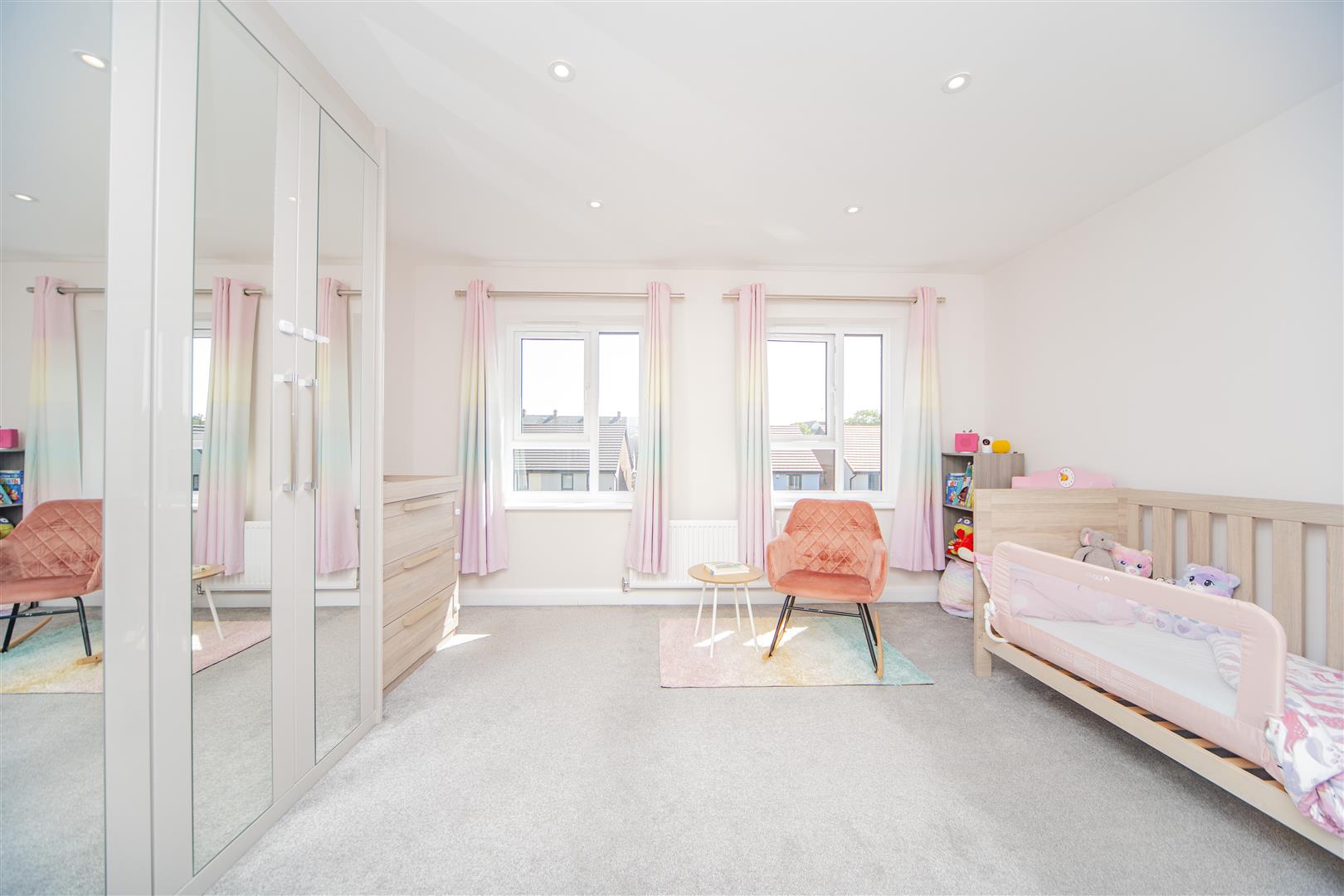 The top floor offers two further generously sized bedrooms, each with mirrored fitted wardrobes and additional storage, alongside a contemporary family bathroom finished with full tiling, a bath, and overhead shower.
