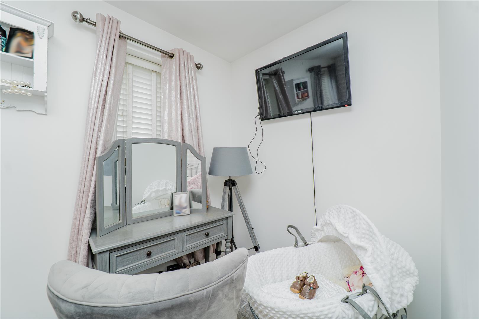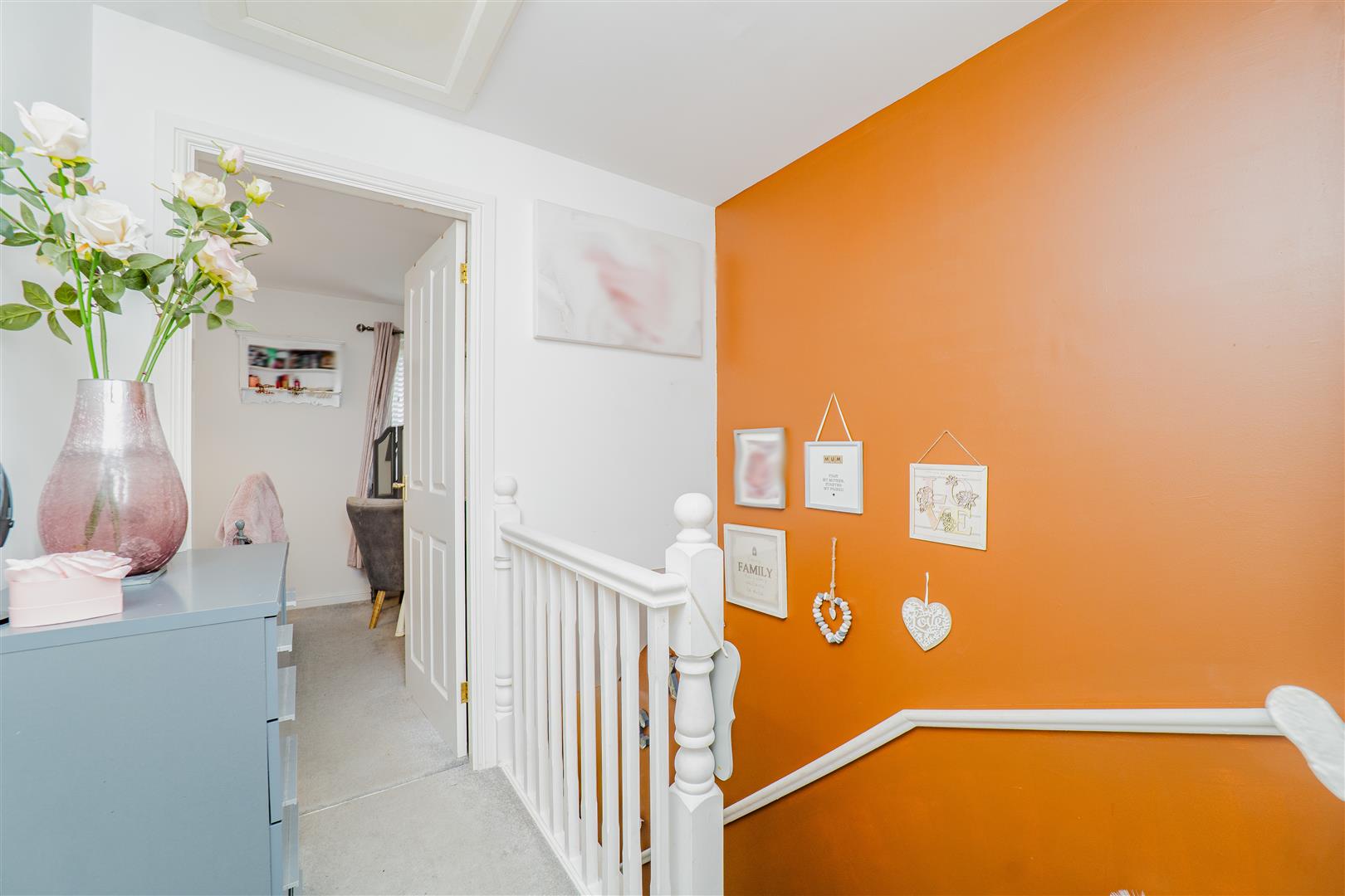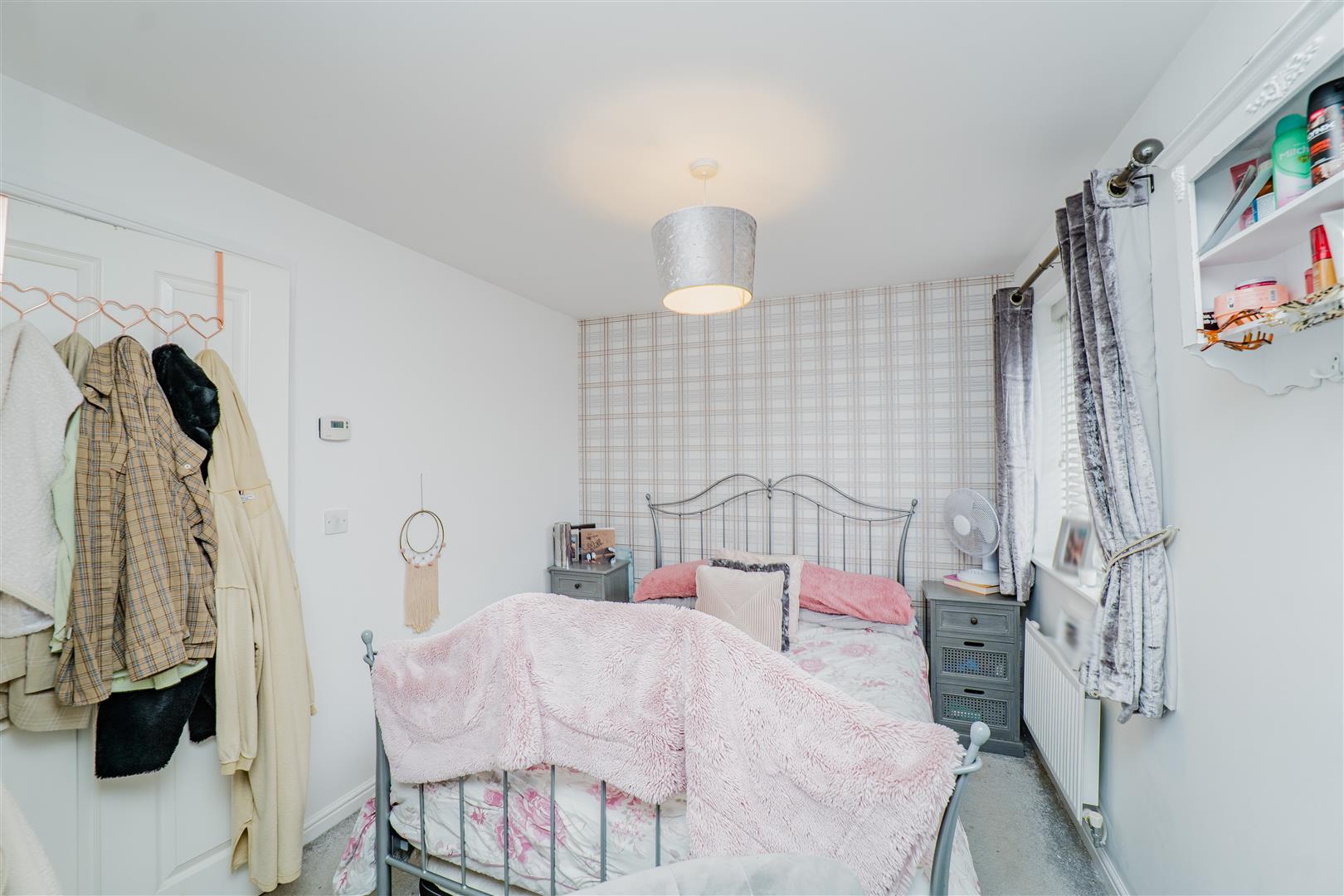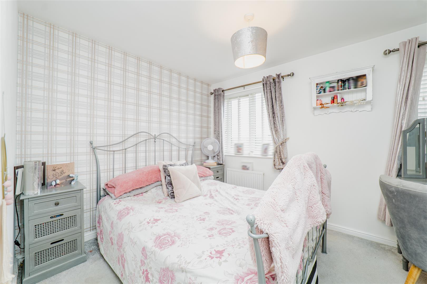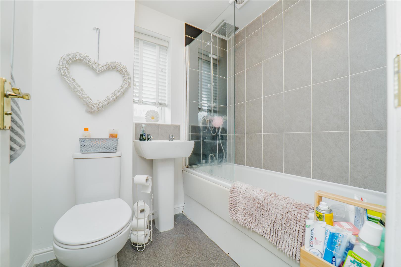 Upstairs, the property continues to impress with two spacious bedrooms, one of which benefits from a built-in storage cupboard. The first floor is finished with grey carpets throughout, adding to the home’s cohesive and modern feel. The family bathroom comprises a bath with overhead shower, along with a white toilet and sink, finished with grey tiled splashbacks and grey flooring.