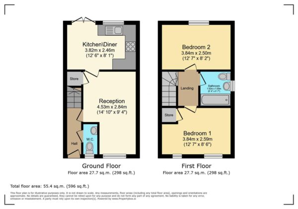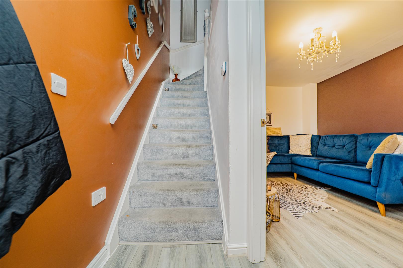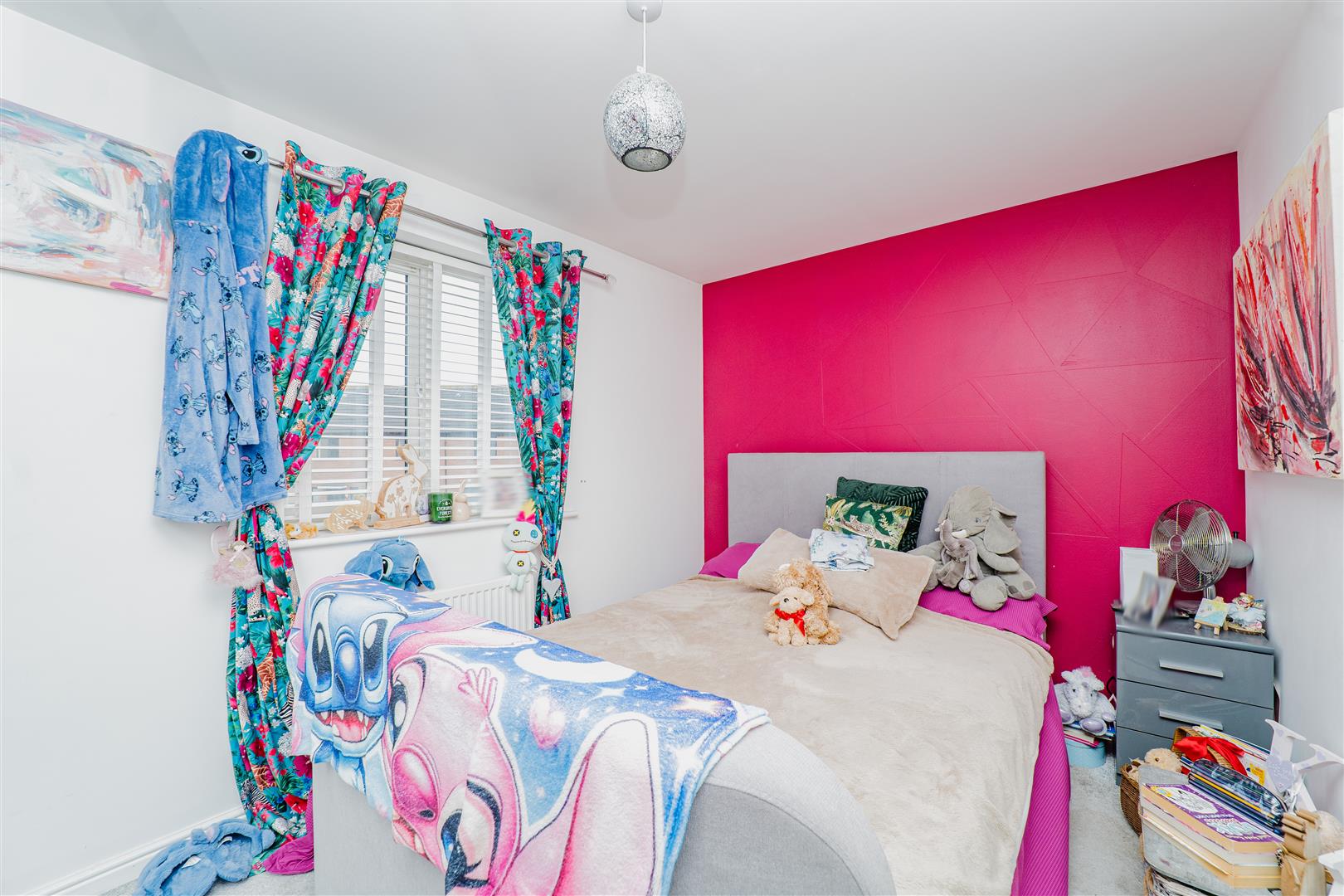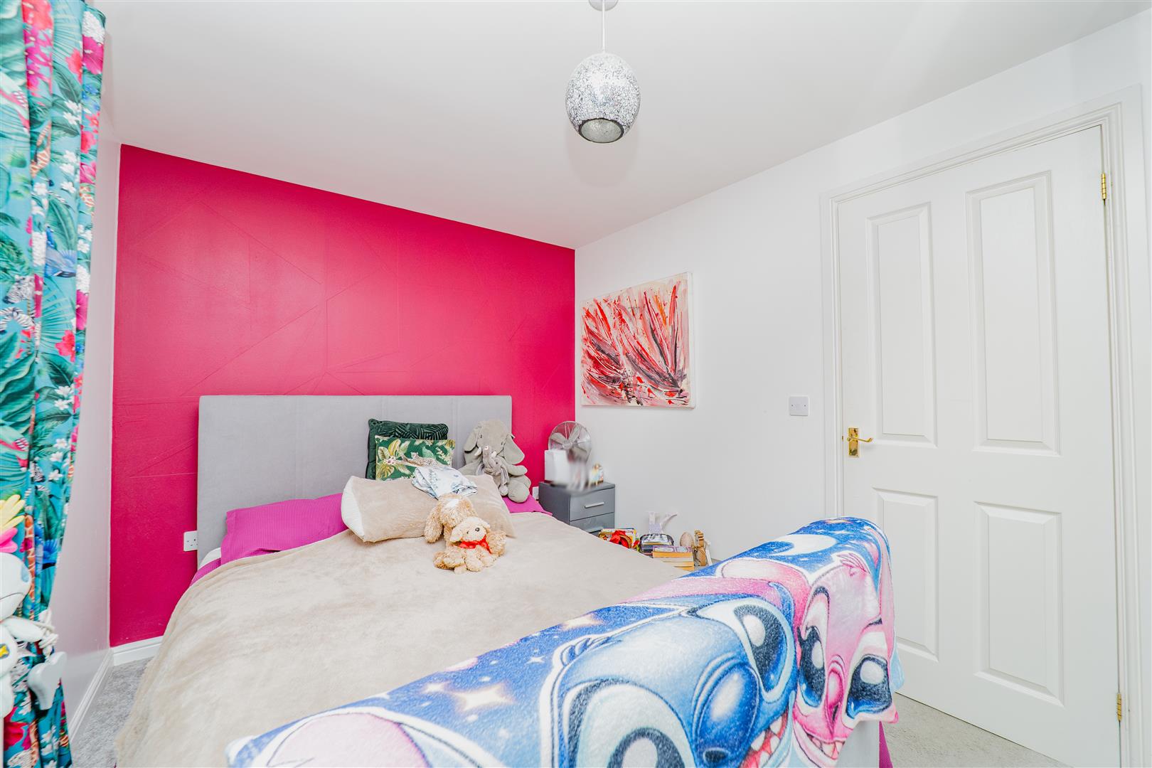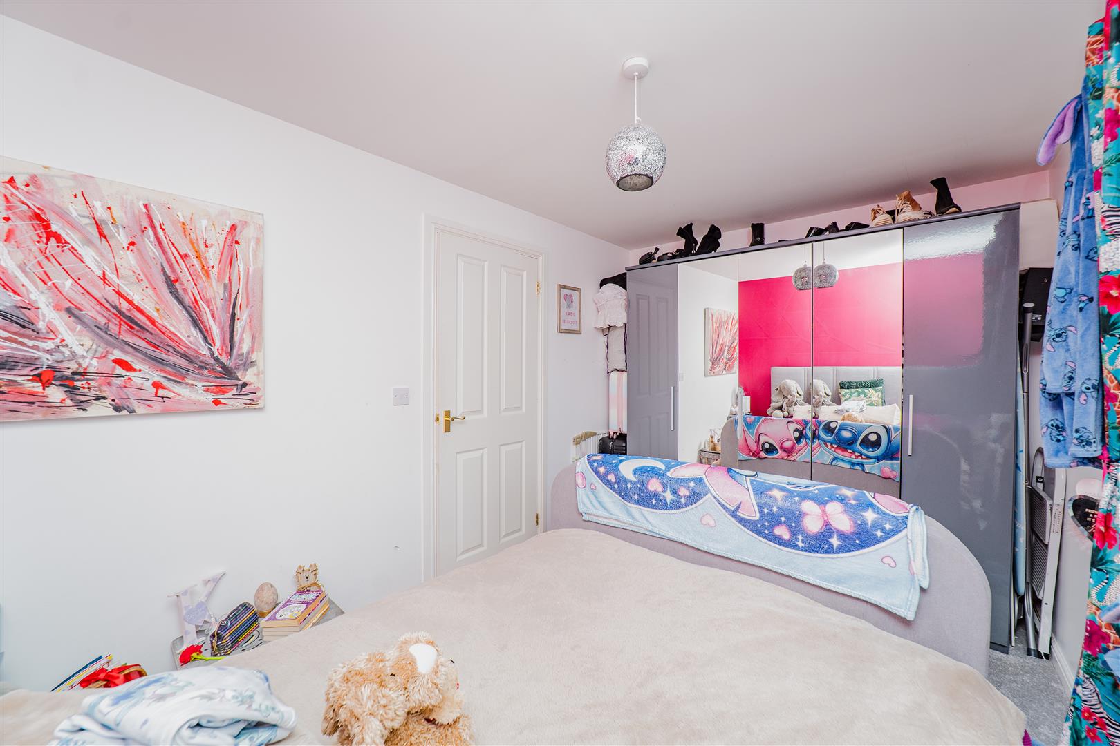 Upstairs, the property continues to impress with two spacious bedrooms, one of which benefits from a built-in storage cupboard. The first floor is finished with grey carpets throughout, adding to the home’s cohesive and modern feel. The family bathroom comprises a bath with overhead shower, along with a white toilet and sink, finished with grey tiled splashbacks and grey flooring.