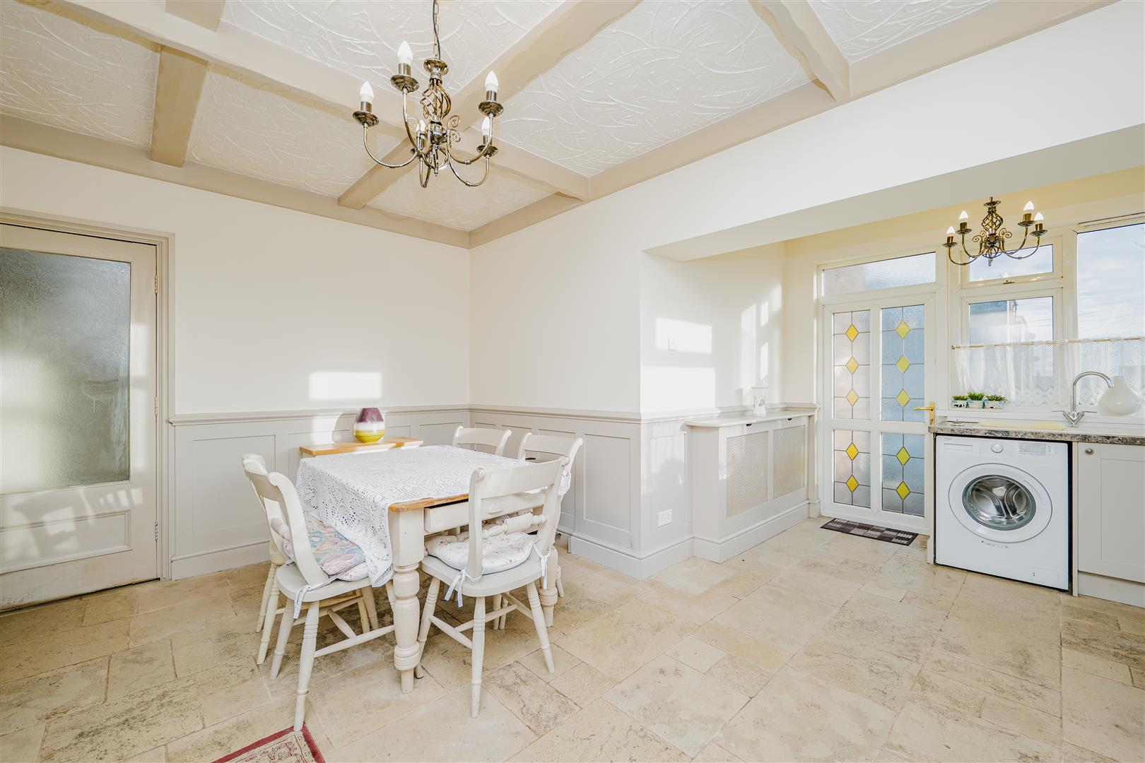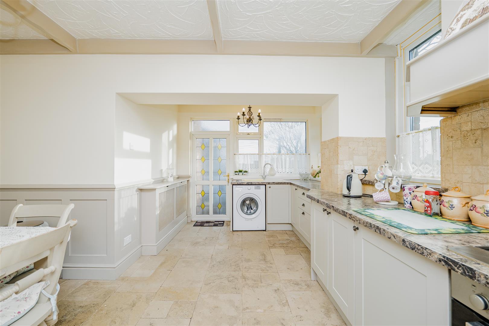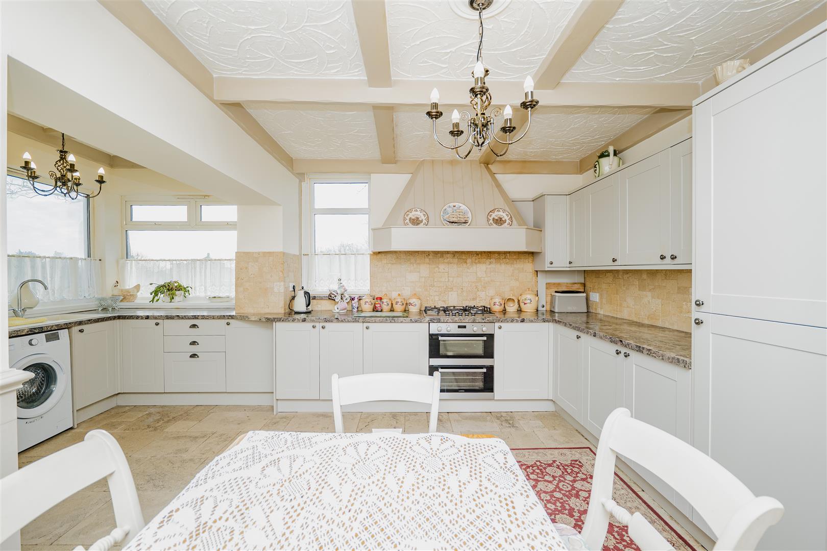 The heart of the home is the fabulous open-plan kitchen/diner. The kitchen is fitted with neutral-coloured cupboards and distinctive patterned worktops, offering ample storage and generous worktop space. Stone flooring runs throughout this area, and there is plenty of room for a dining table, making it ideal for both everyday living and entertaining.