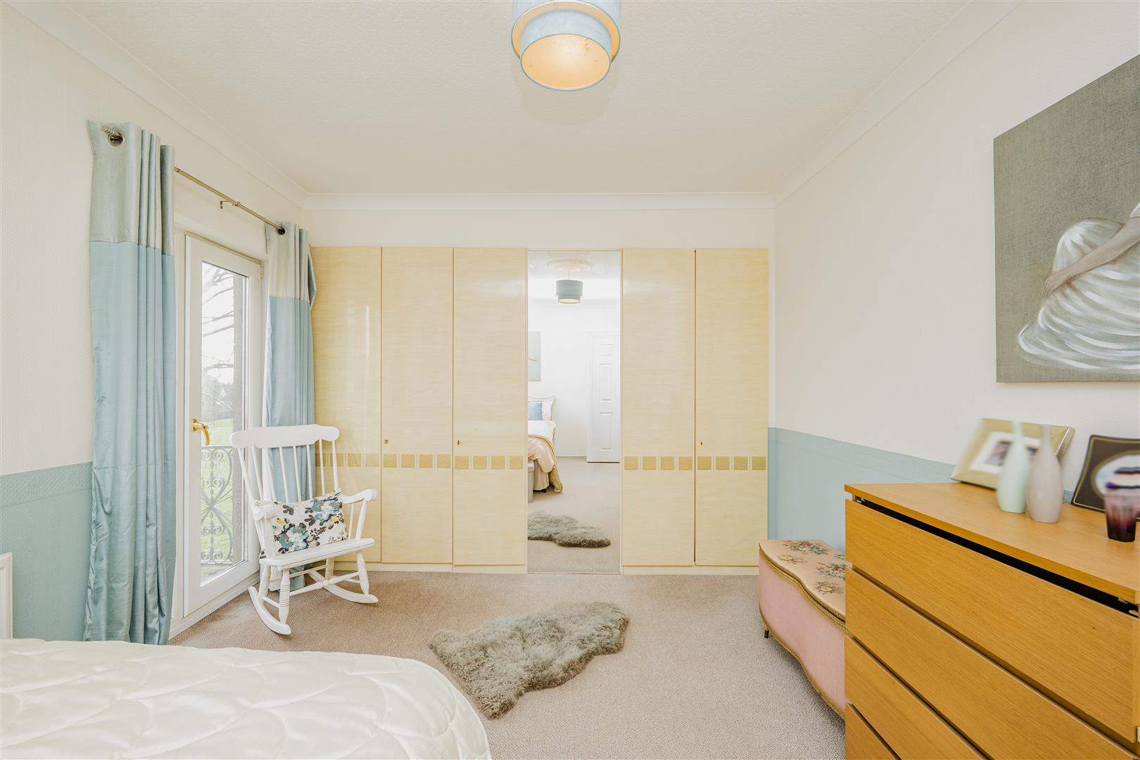 On the first floor, the property offers four spacious bedrooms. The principal bedroom is positioned at the front of the house and mirrors the bay window below. Bedroom two benefits from fitted wardrobes and access to a balcony overlooking attractive green space, perfect for relaxing. Bedroom three includes built-in storage, while the fourth bedroom is also well-proportioned.