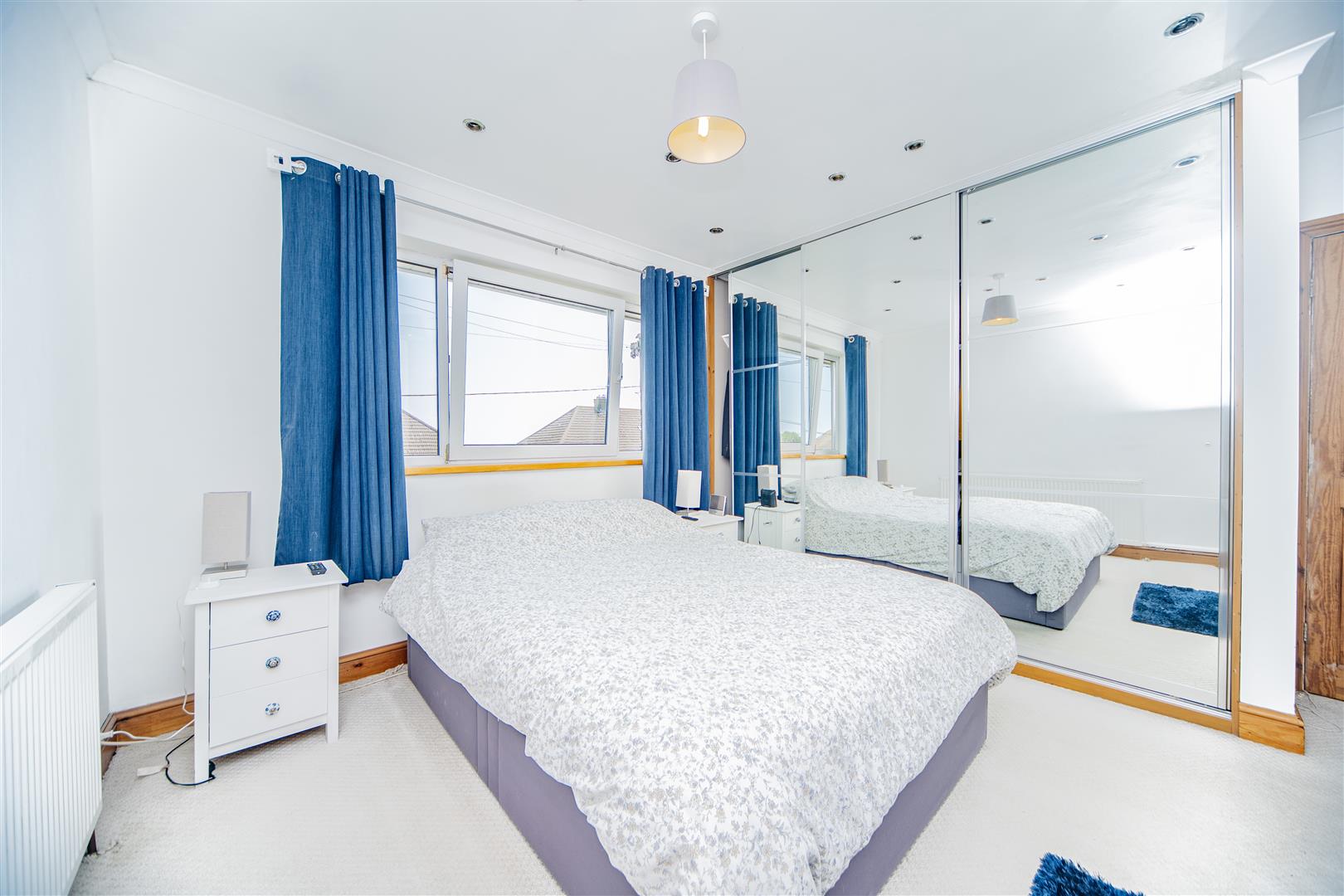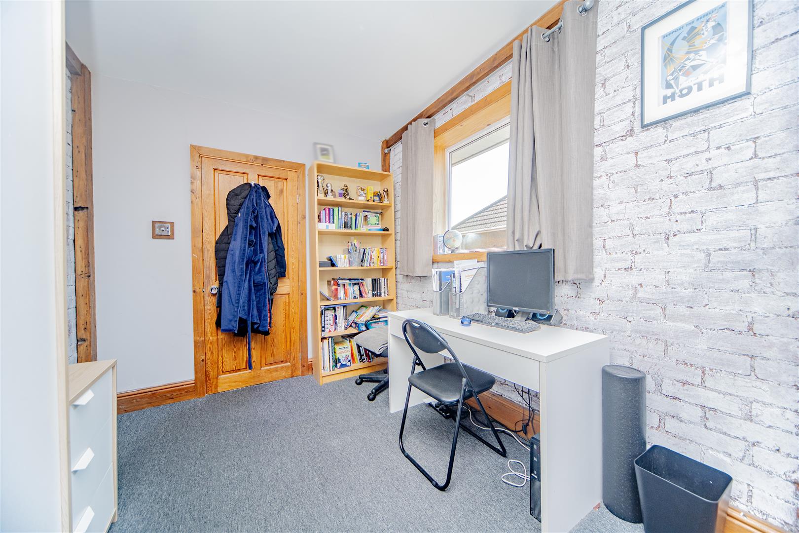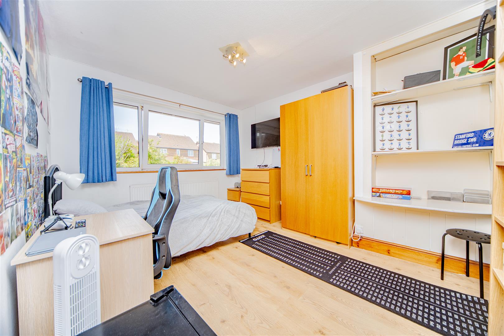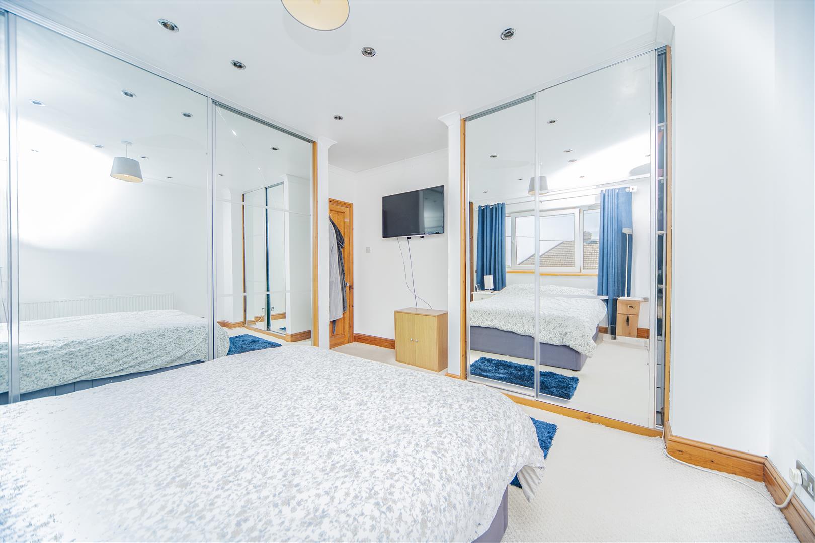 Upstairs, the property offers three generously sized bedrooms. The front-facing main bedroom benefits from fitted mirrored wardrobes, providing ample storage. The family bathroom features a bath, toilet, and sink, finished with stylish dark grey flooring and matching splashback. Wooden doors are featured throughout the property, adding to its cohesive and warm ambience.