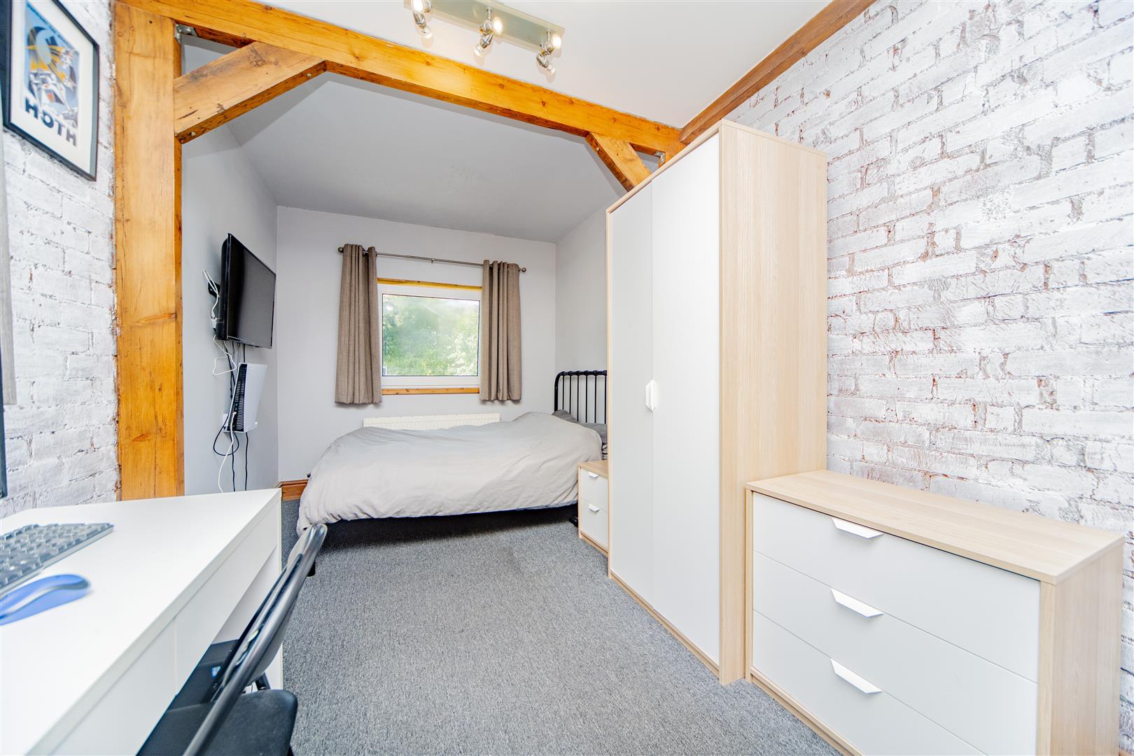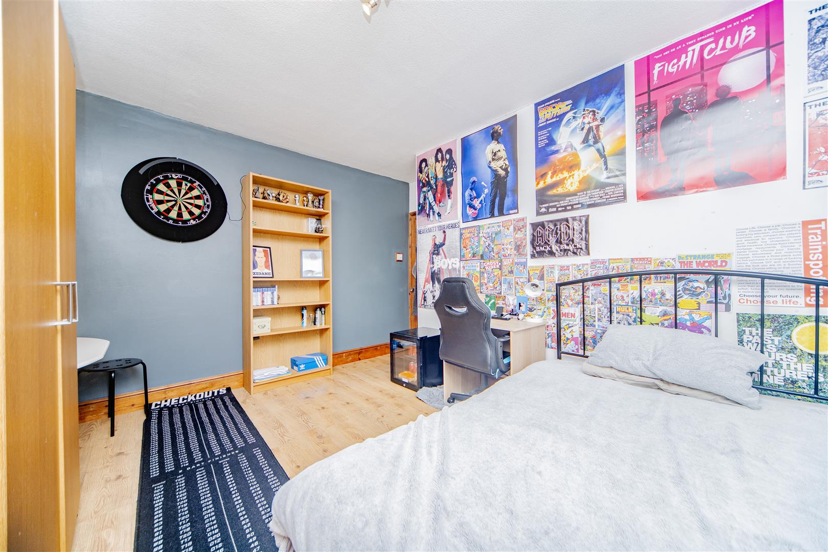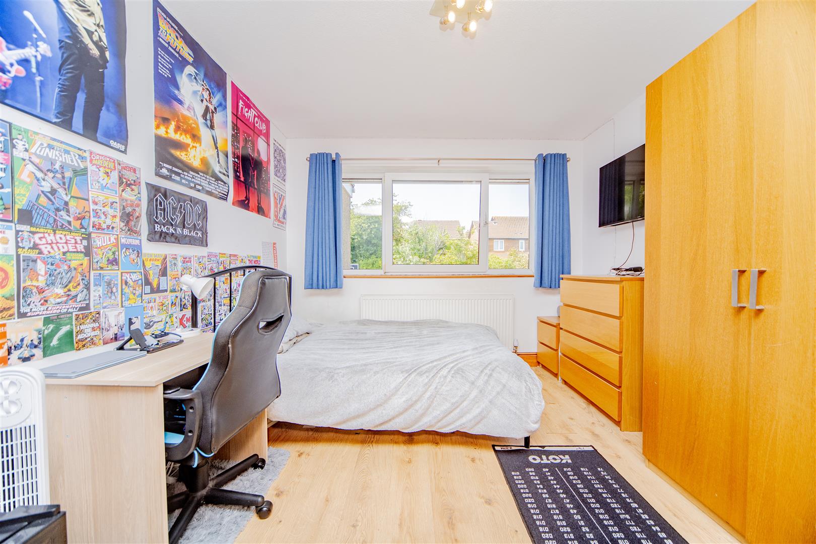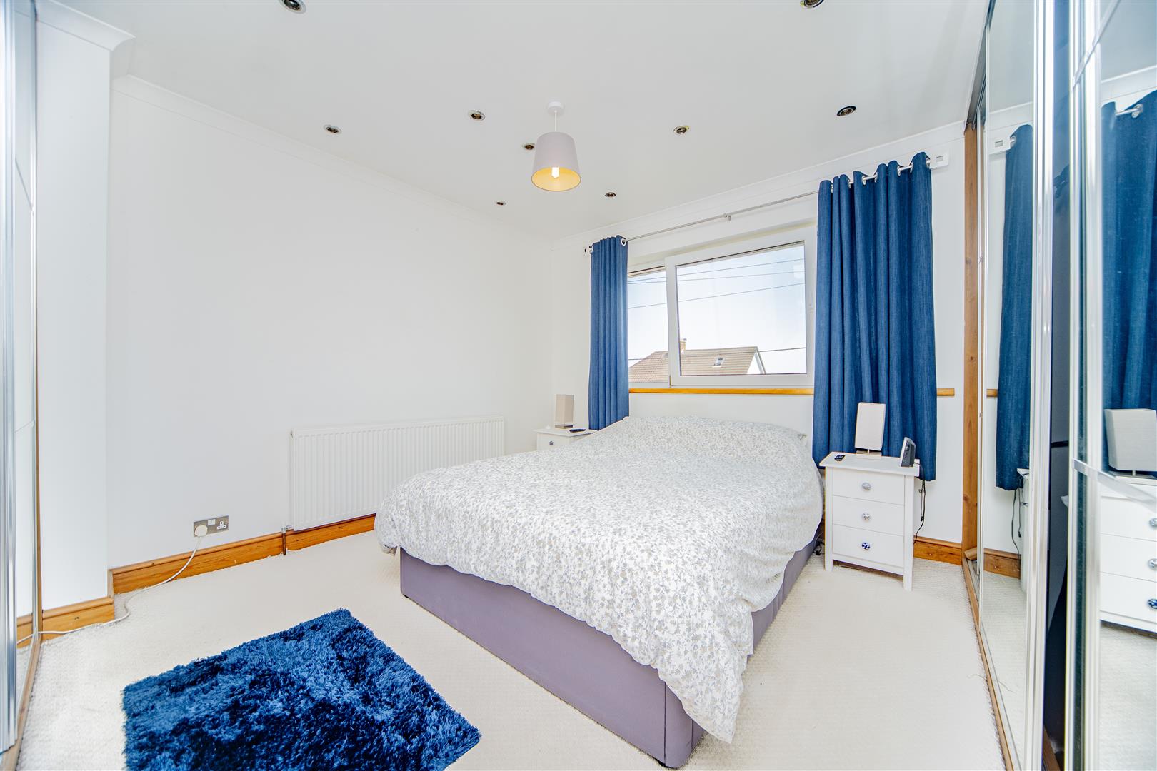 Upstairs, the property offers three generously sized bedrooms. The front-facing main bedroom benefits from fitted mirrored wardrobes, providing ample storage. The family bathroom features a bath, toilet, and sink, finished with stylish dark grey flooring and matching splashback. Wooden doors are featured throughout the property, adding to its cohesive and warm ambience.