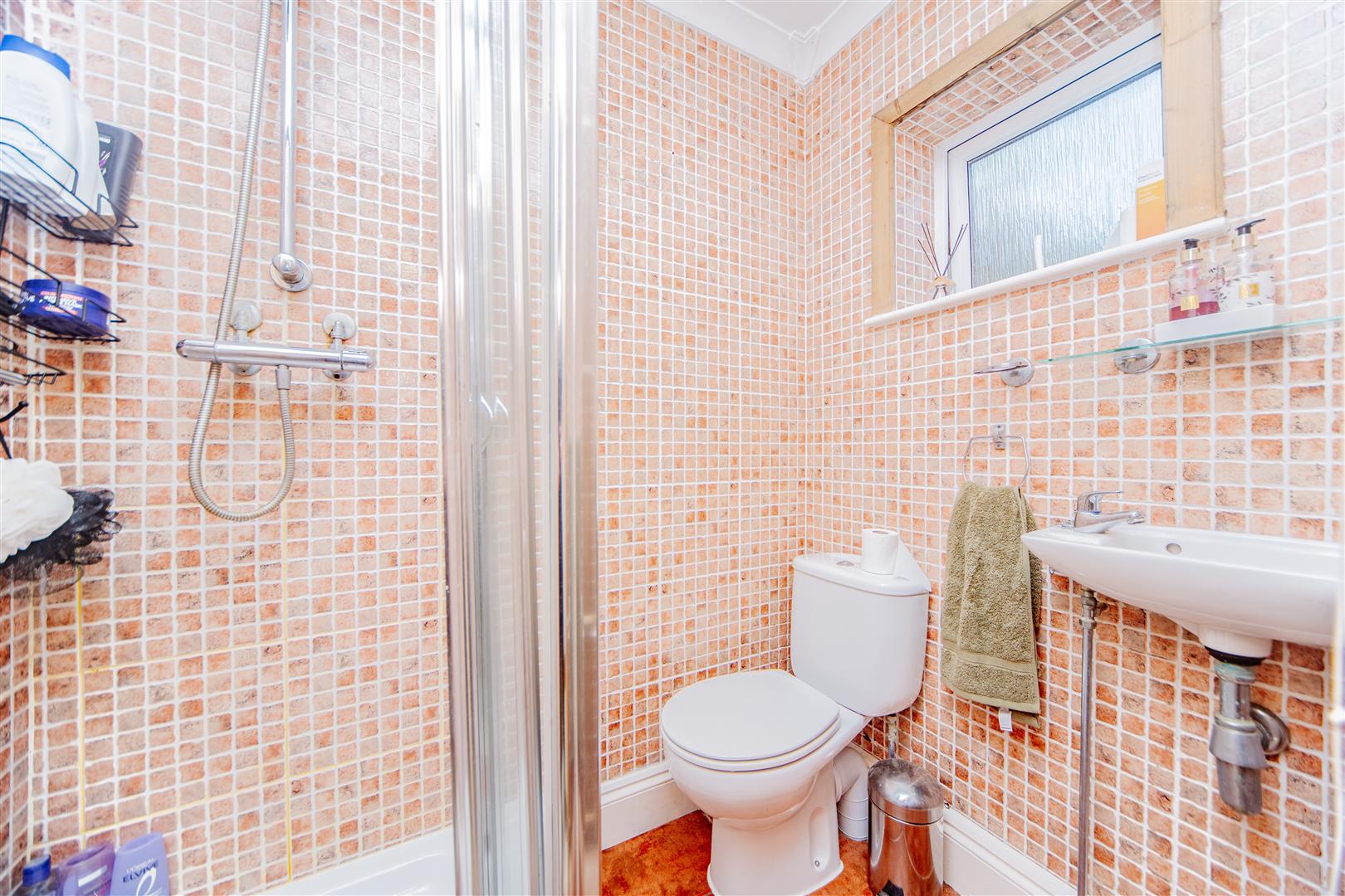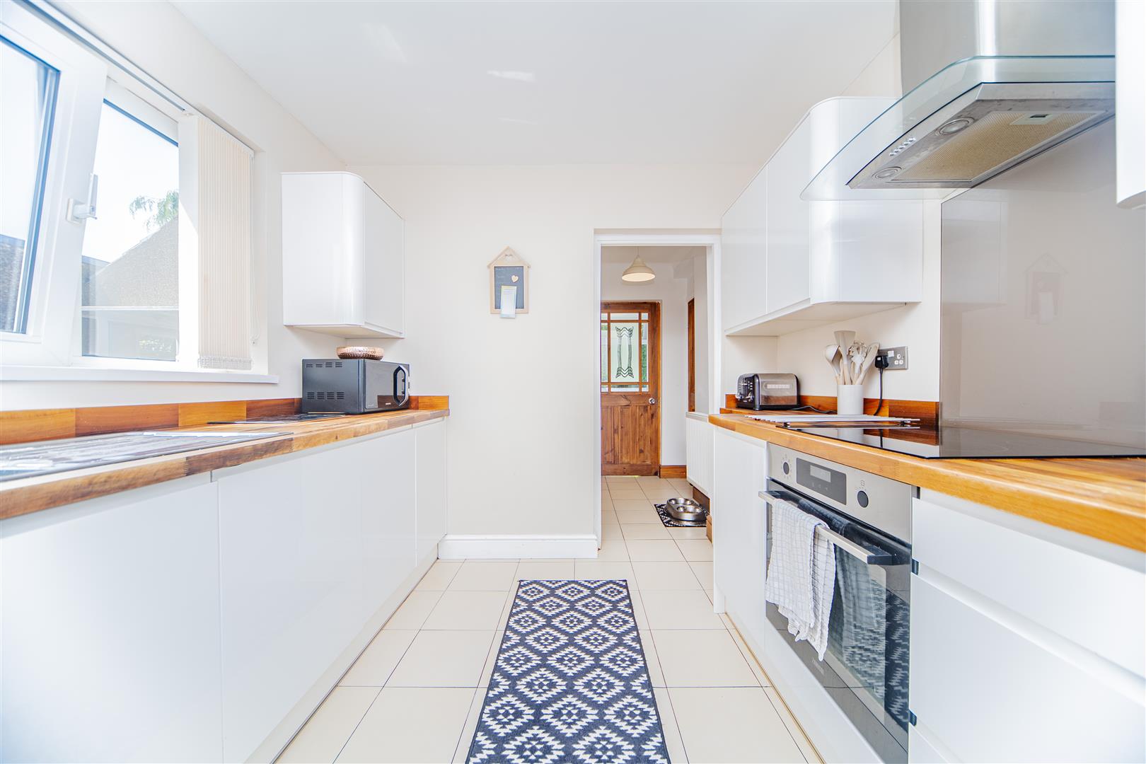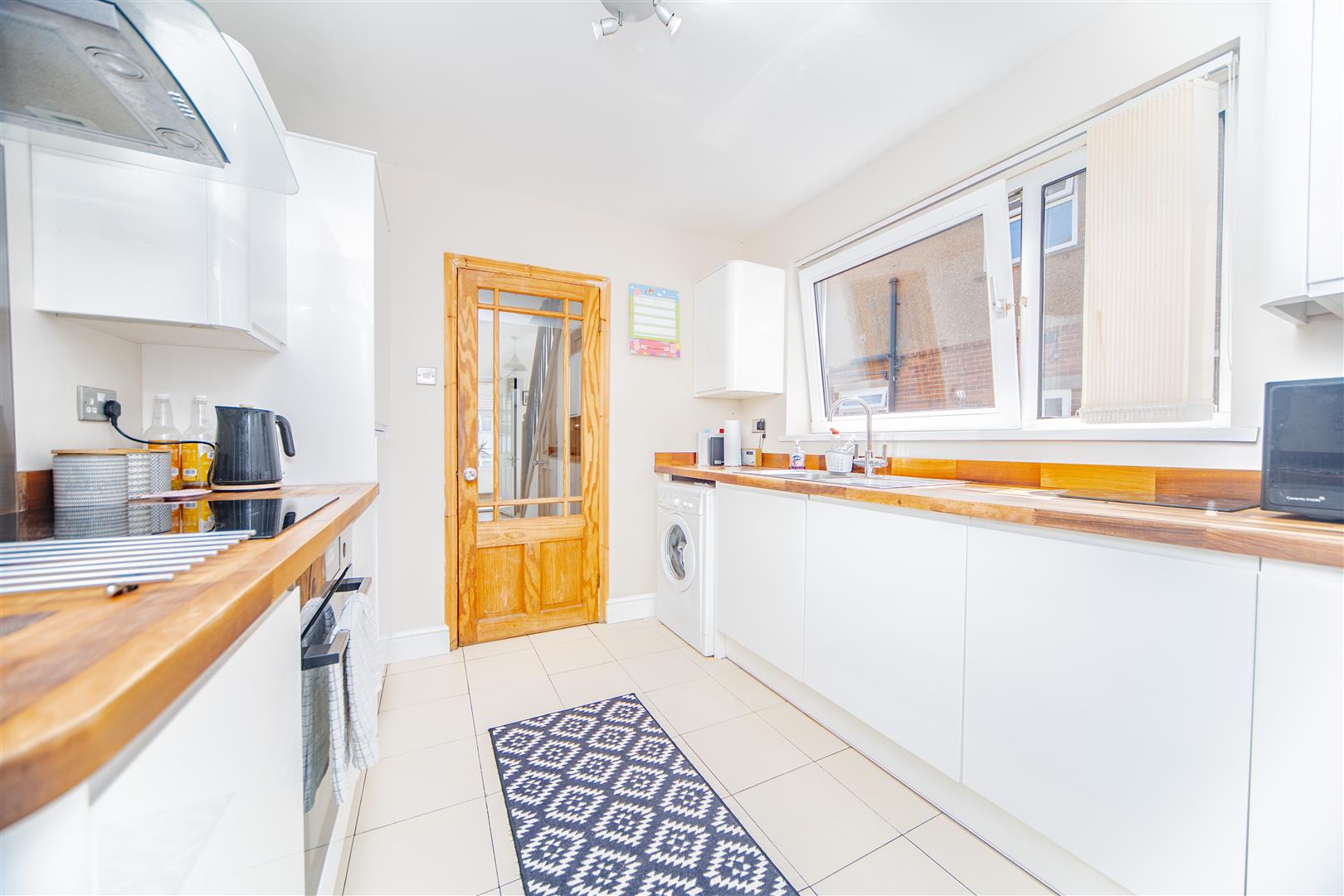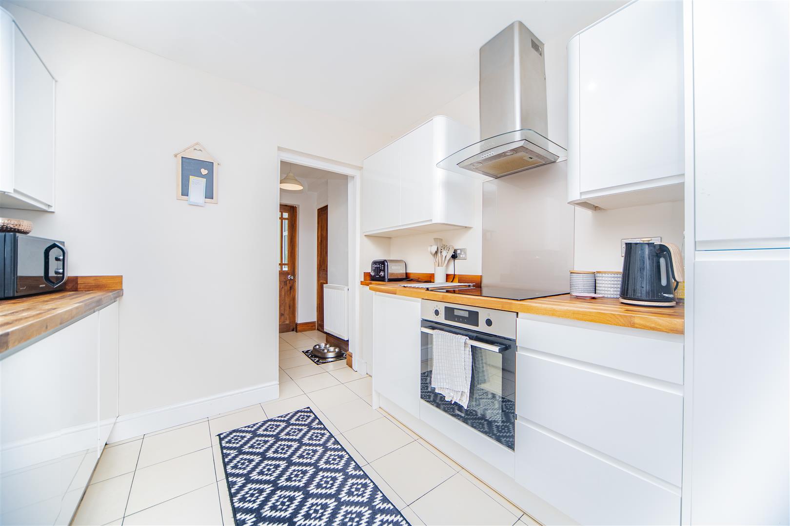 The modern kitchen is fitted with sleek, high-gloss white units, complemented by wooden worktops, and offers plenty of storage and preparation space. Integrated appliances include an oven, hob, fridge/freezer and dishwasher. A rear hallway from the kitchen provides access to a contemporary shower room with a toilet and sink, as well as a door to the back garden for added convenience.