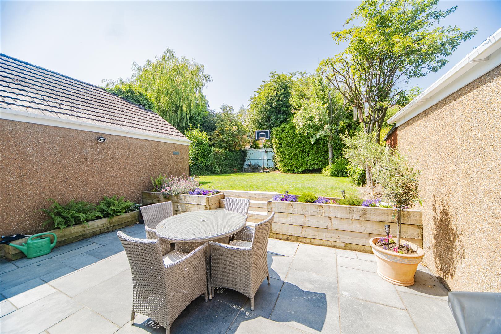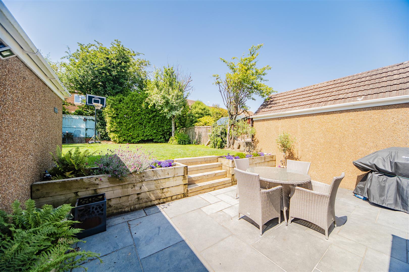 The rear garden is a standout feature, offering a substantial outdoor space. A paved patio area directly outside the dining room is ideal for seating and summer barbecues. Steps lead up to a large lawn area, with a further flat section at the rear that provides potential for an additional seating area or outdoor retreat.