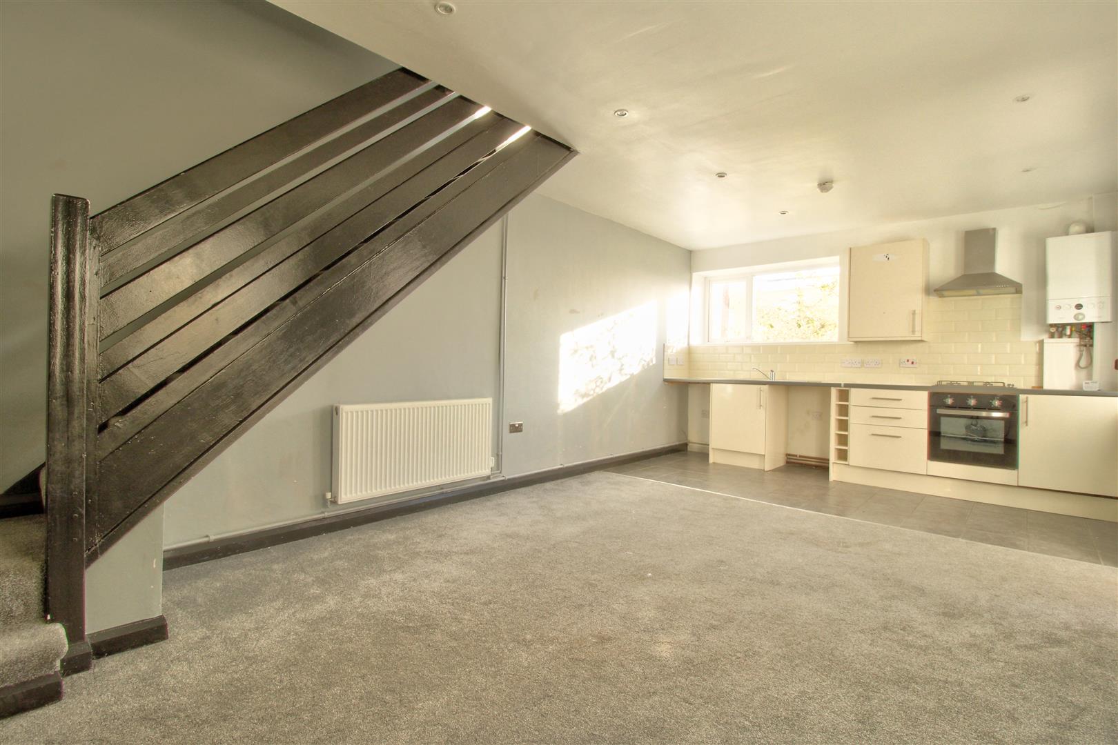 The property is entered on the ground floor into a spacious, open-plan living room, dining area, and kitchen, creating a bright, practical living space ideal for modern lifestyles. The kitchen is fitted with a range of wall and base units, an integrated oven and hob, and provides direct access via a rear door to the enclosed garden, which also benefits from rear lane access.