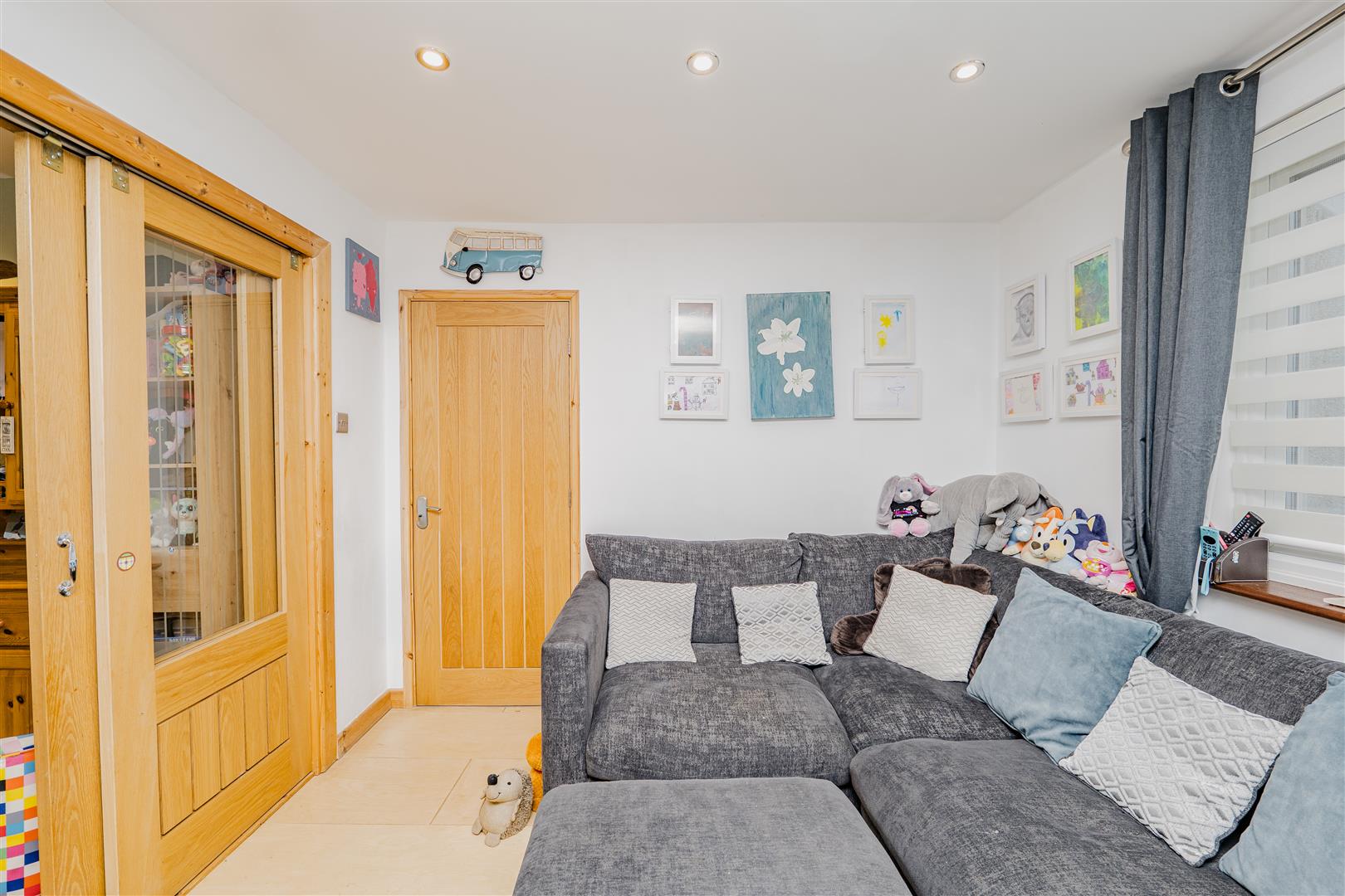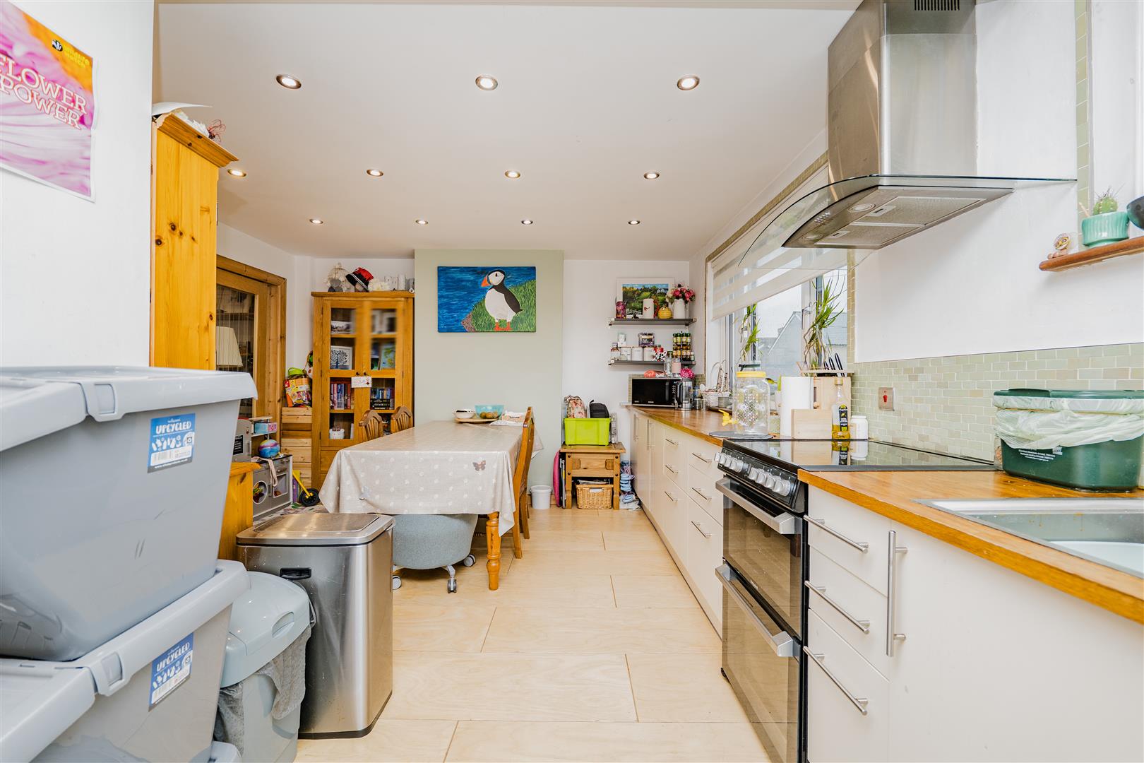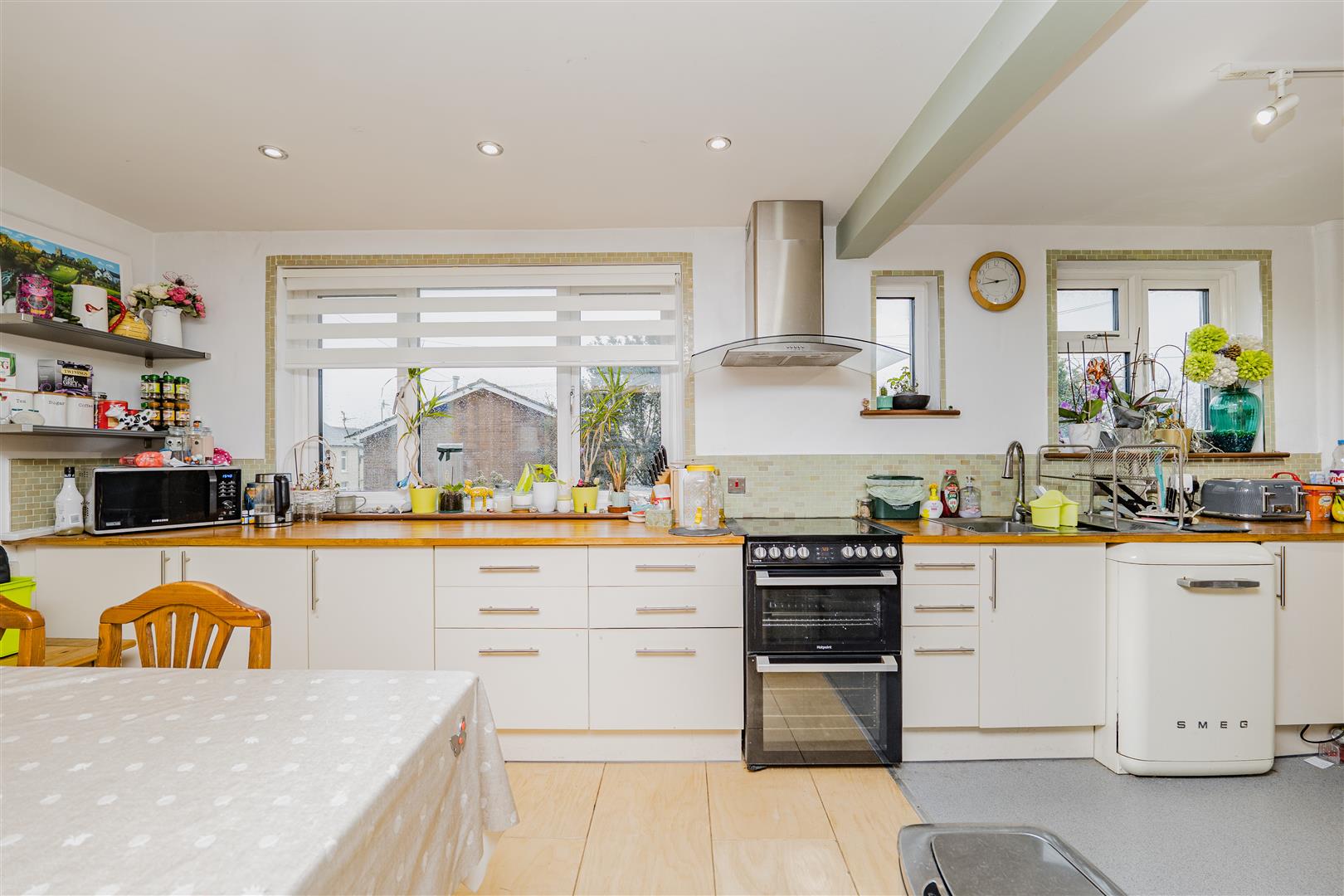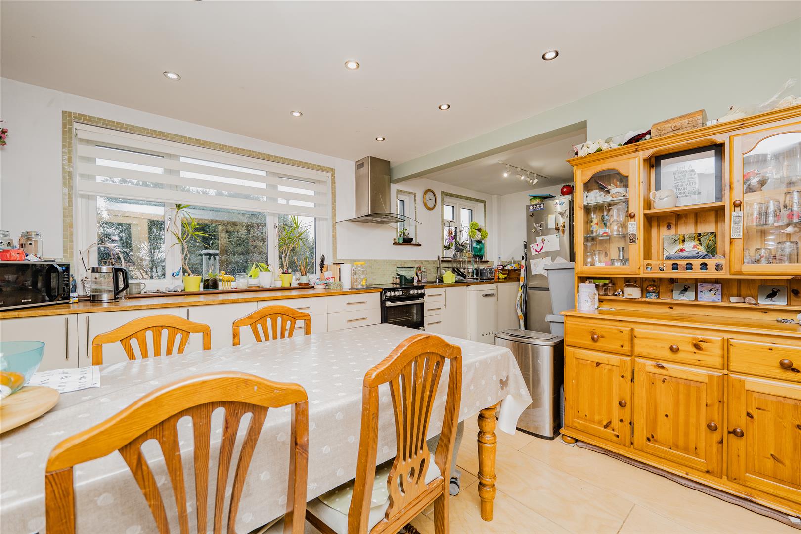 The kitchen/diner is generously proportioned and also benefits from neutral tiled flooring. It offers ample cupboard and worktop space, with light-coloured units complemented by wooden work surfaces. There is plenty of room for a family dining table, making it an ideal space for both everyday living and entertaining. A useful storage cupboard is located here, along with access to the basement.