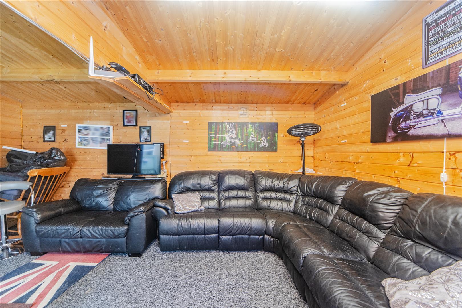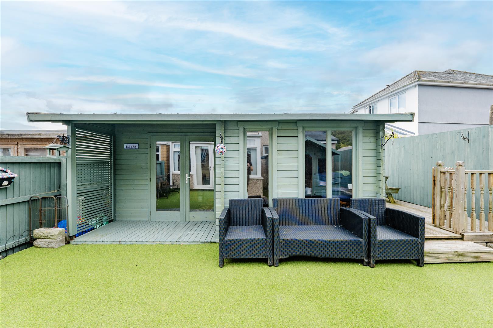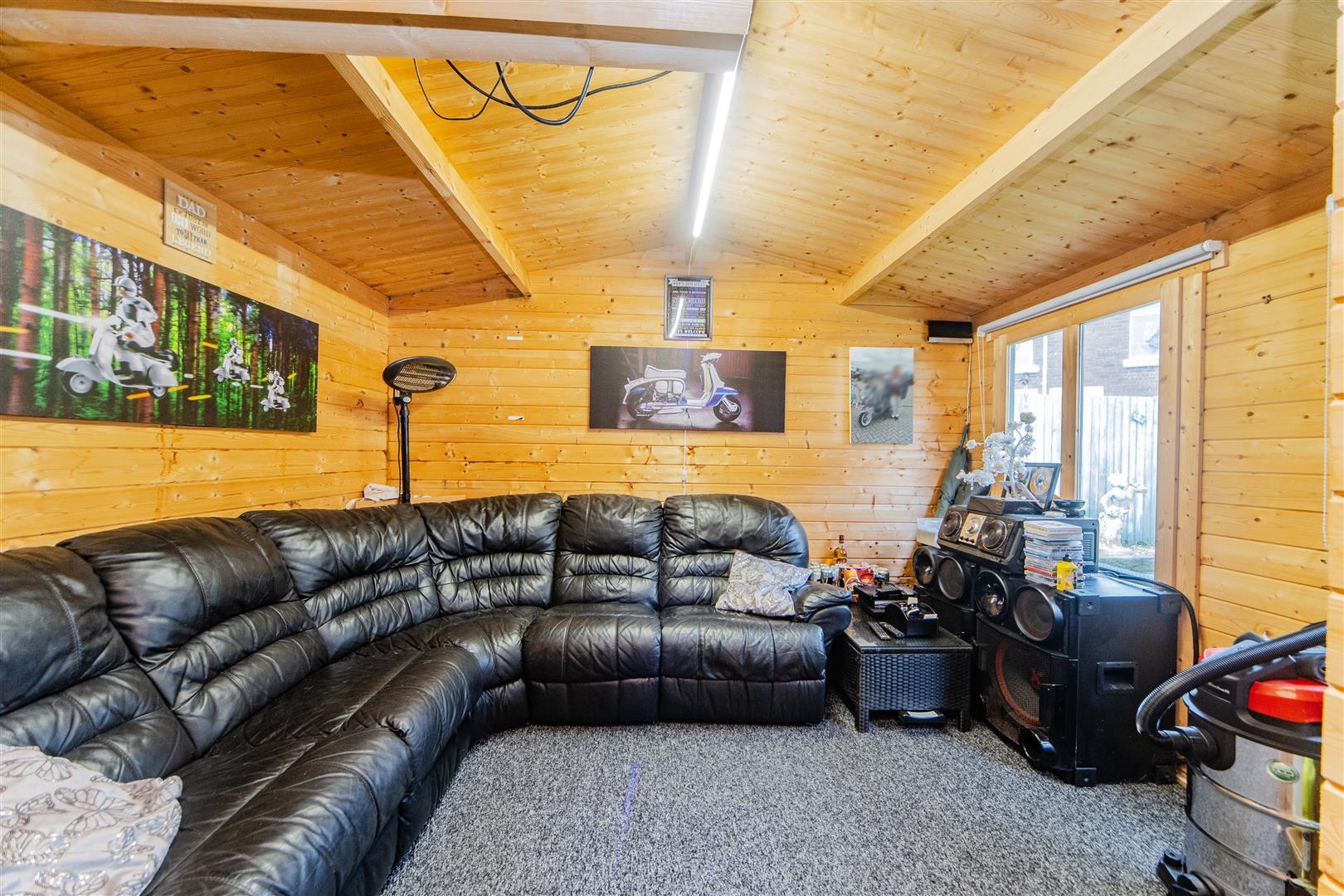 The rear garden has been designed for low maintenance and features a generous artificial grass area, perfect for outdoor dining or relaxing. It also boasts two summer houses: the larger one, complete with electric ports, is ideal for use as a sitting room or games room, while the smaller summer house currently serves as storage but could easily double as an additional seating area. The garden also provides rear access to the garage, enhancing convenience.