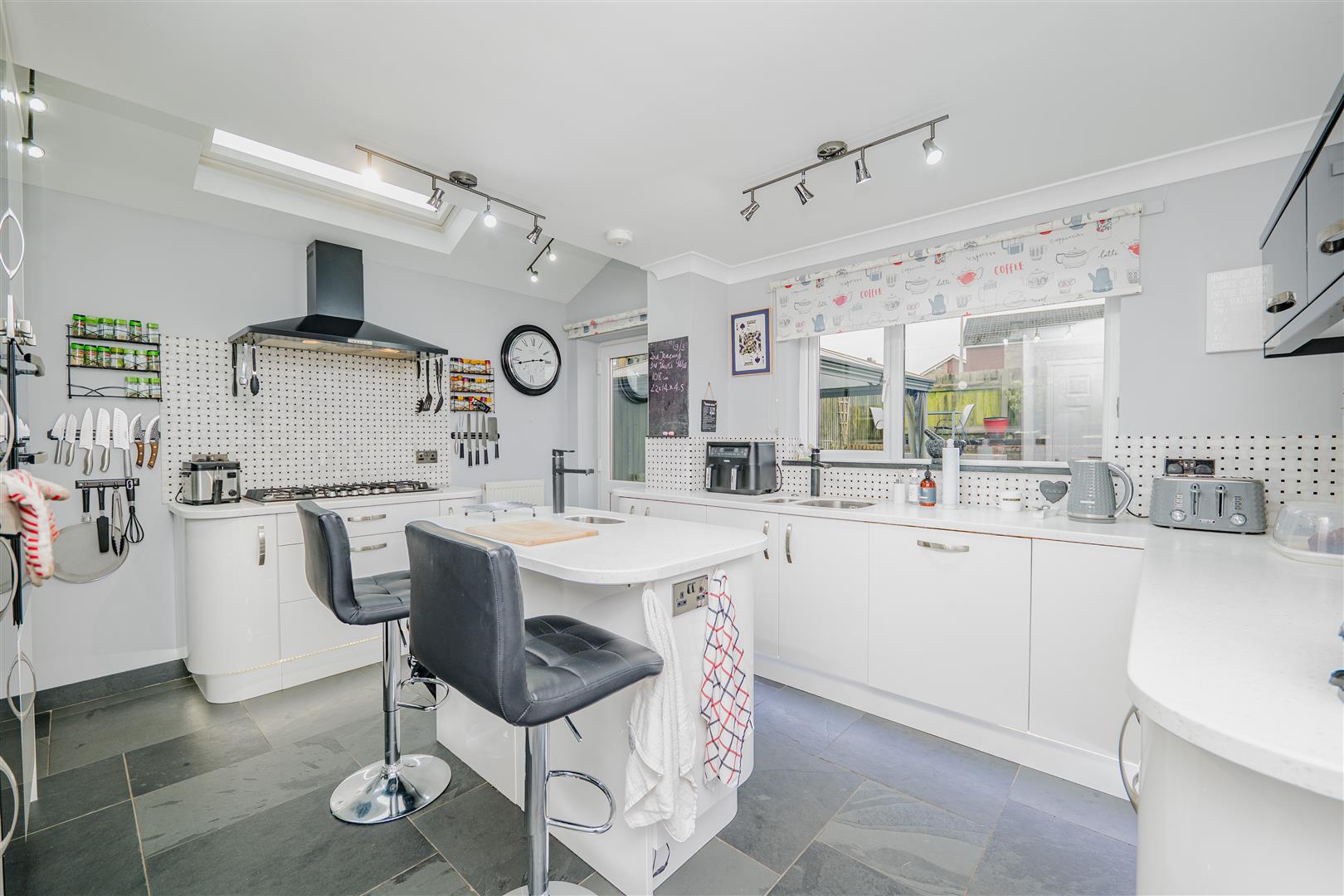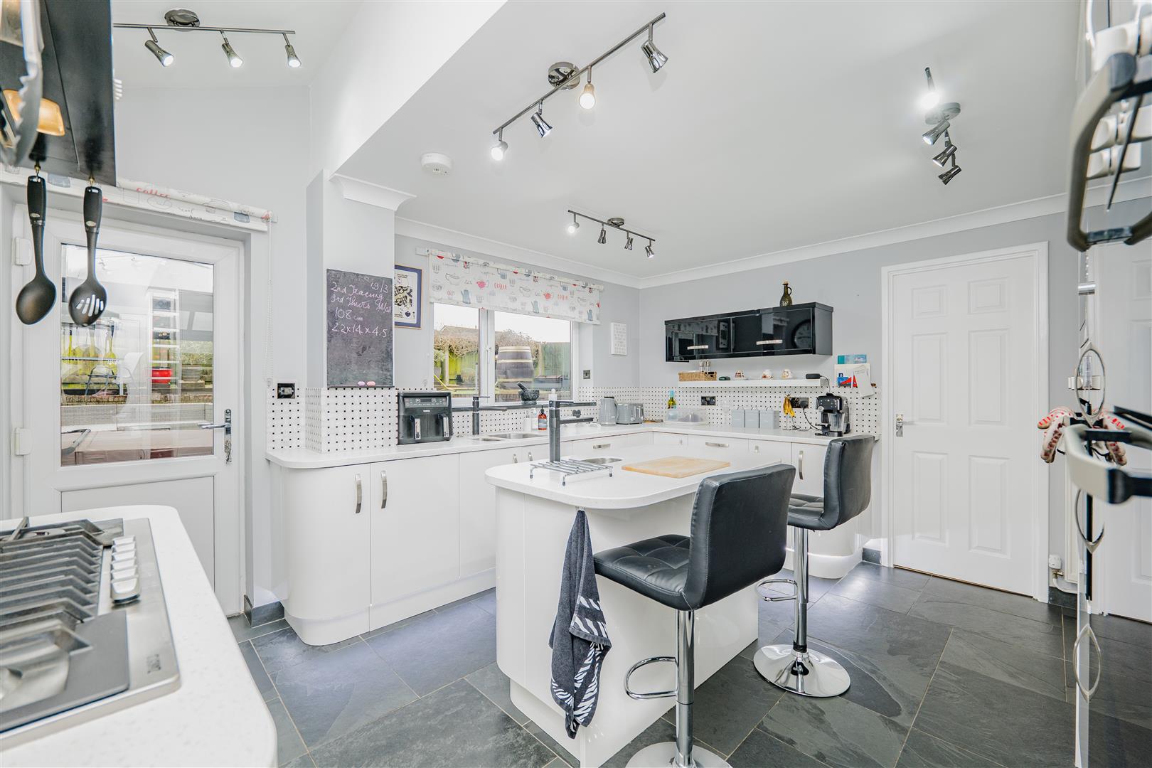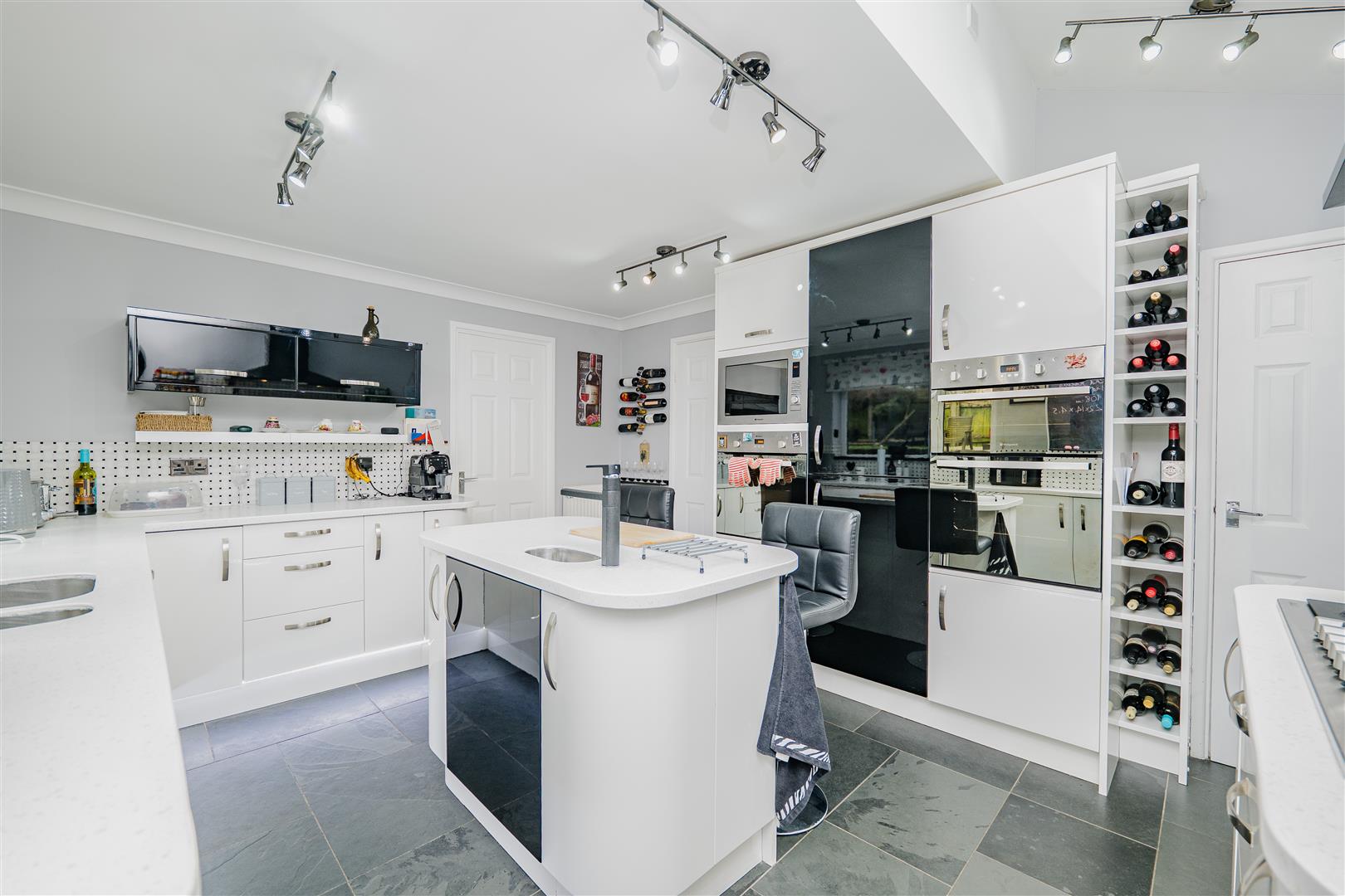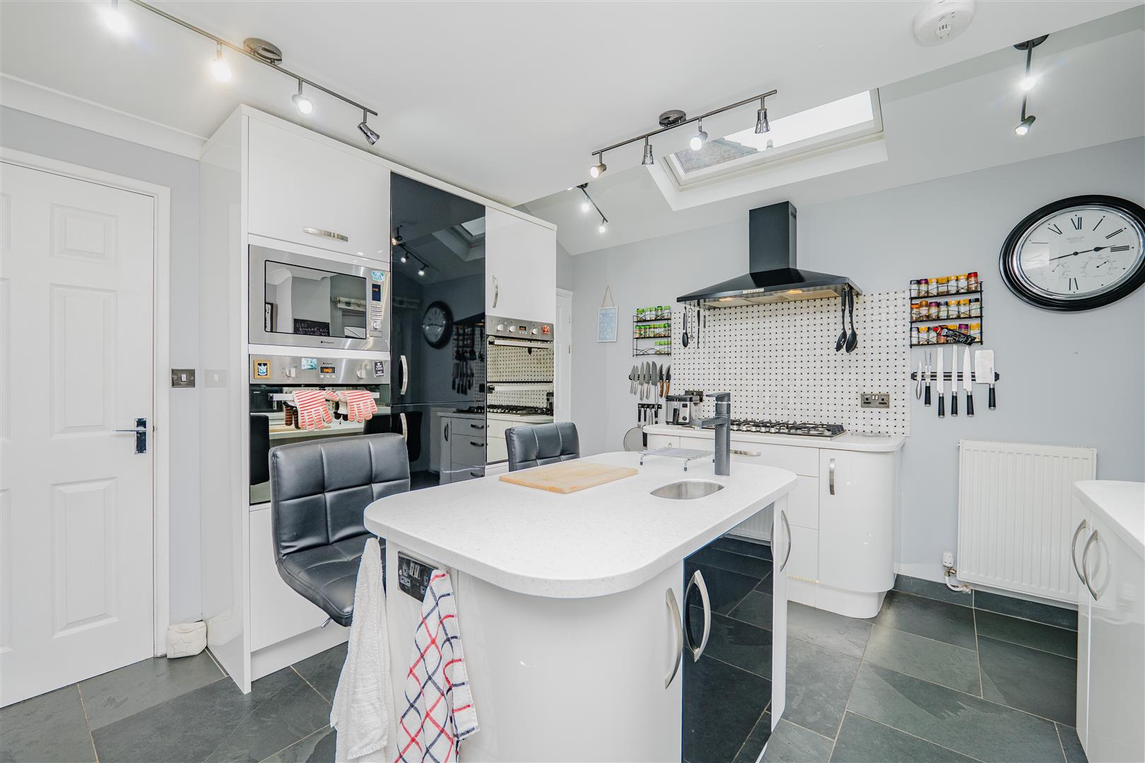 The modern kitchen is well-designed and finished with contemporary units, generous worktop space, and integrated appliances. A central island provides additional preparation space and informal seating, creating a highly practical and social cooking environment. Adjacent to the kitchen is a useful utility room and a convenient ground-floor W.C.