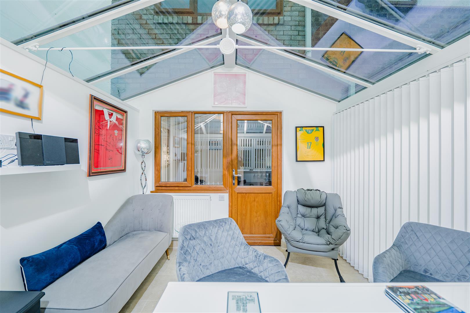 Externally, the property offers off-street parking to the front. The rear garden is attractively landscaped and provides a fantastic outdoor space for families and entertaining, featuring patio areas, an artificial lawn, and seating ideal for enjoying the warmer months.