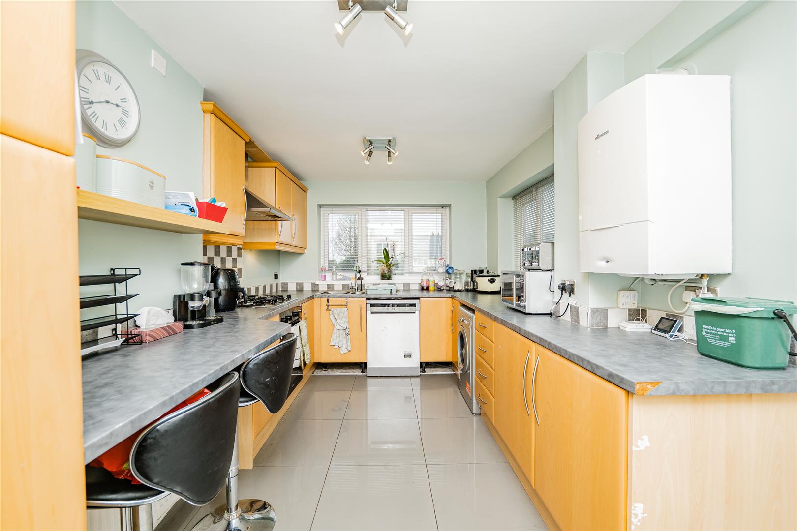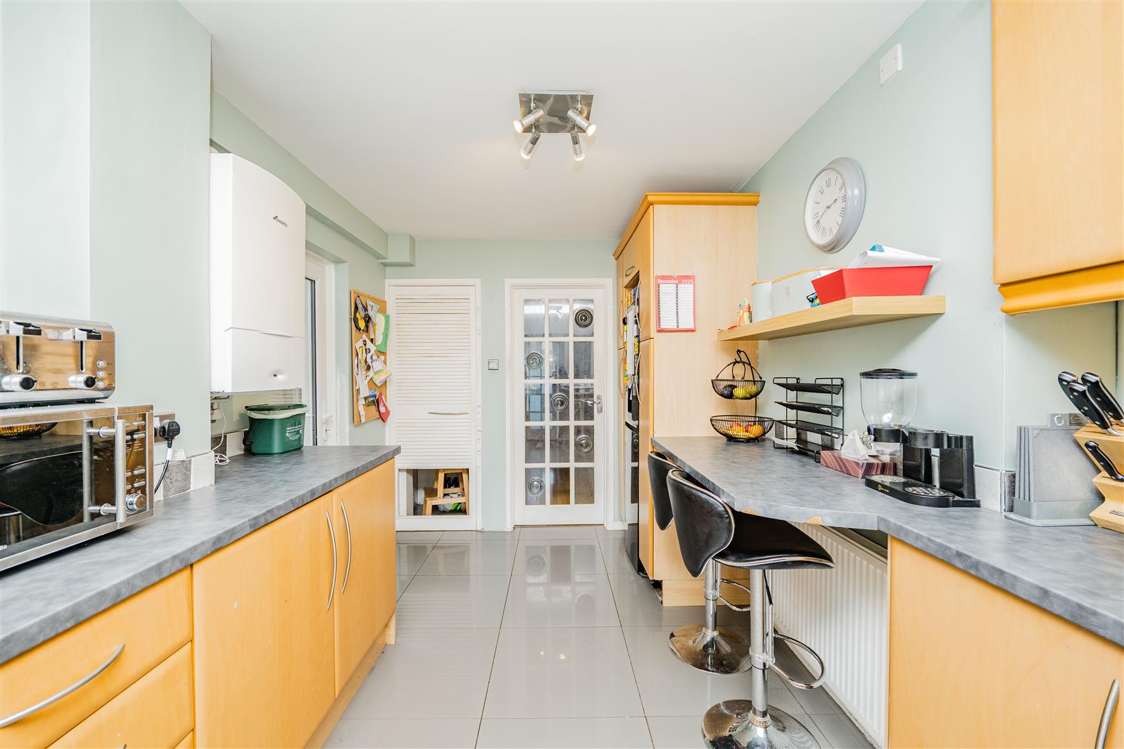The kitchen is another strong feature of the property. Generous in size, it is fitted with wood-effect cabinetry and grey worktops, offering plenty of work surface and storage. A practical breakfast bar adds extra versatility, and a door provides side access to the rear garden. The kitchen also includes access to a handy under-stairs storage cupboard.