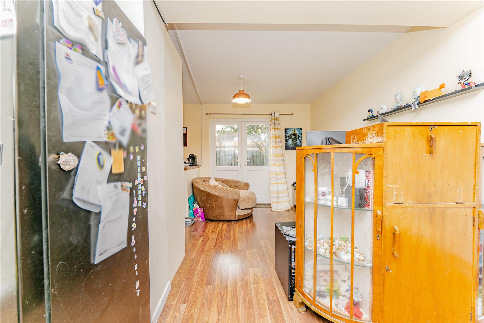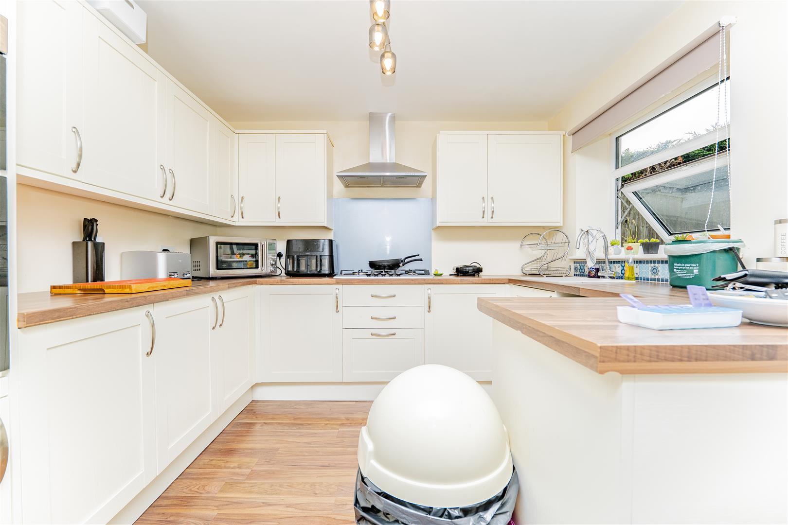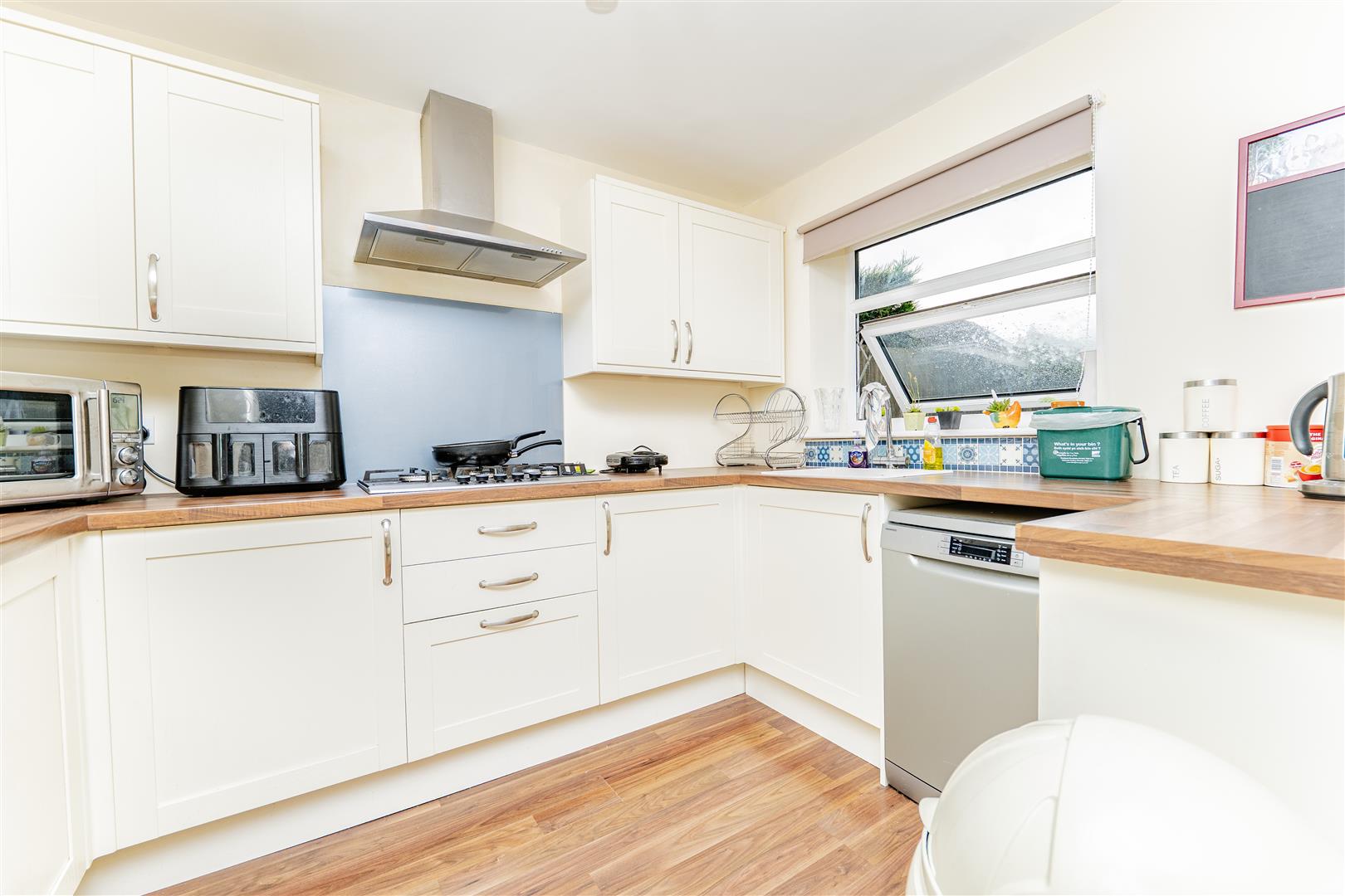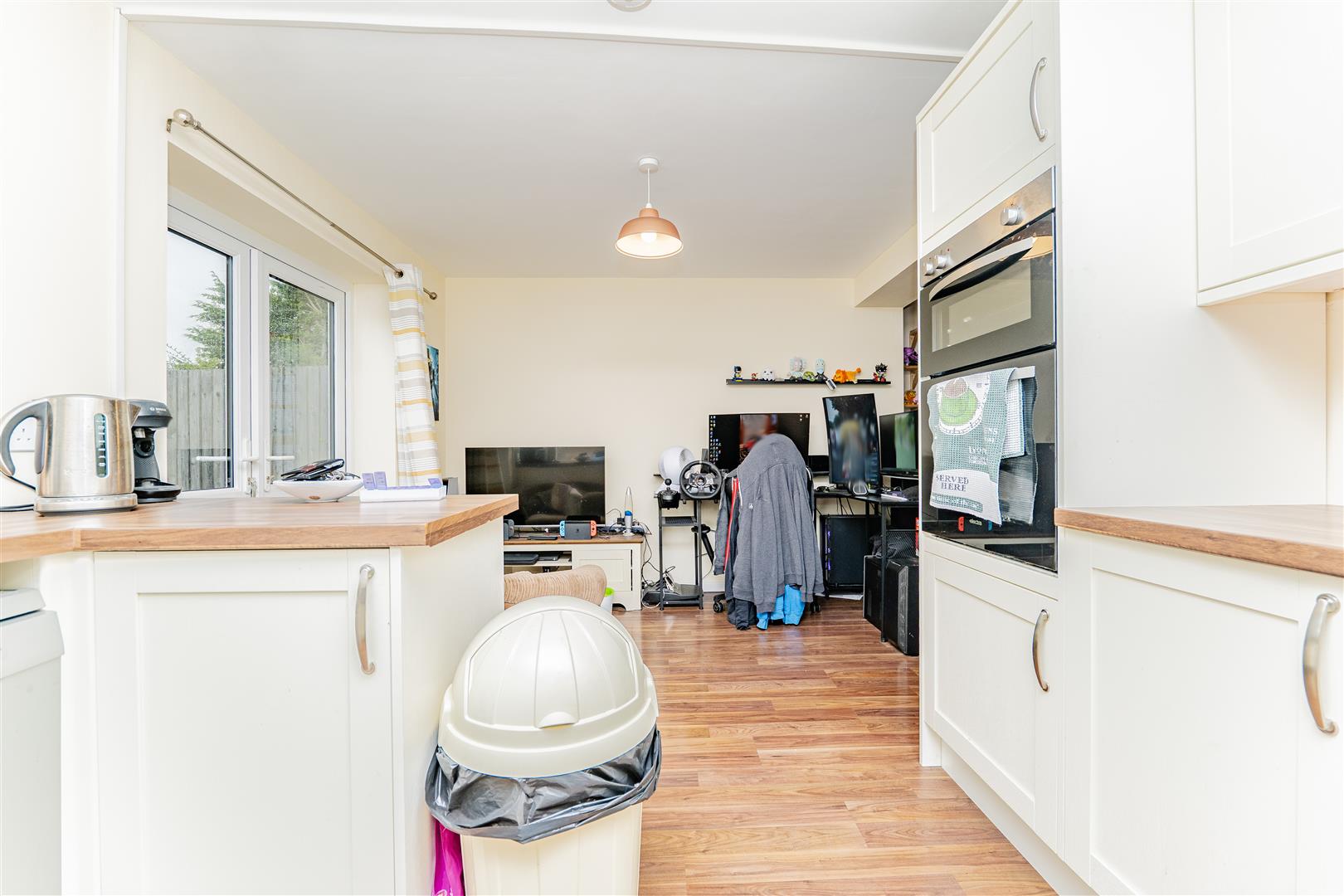 At the rear of the property is a modern kitchen/diner, fitted with white cupboards, sleek silver handles, and wooden worktops. The kitchen offers plenty of cupboard and surface space, along with an integrated hob and double oven. Patio doors open directly onto the rear garden, providing easy access to the outdoors and natural light.