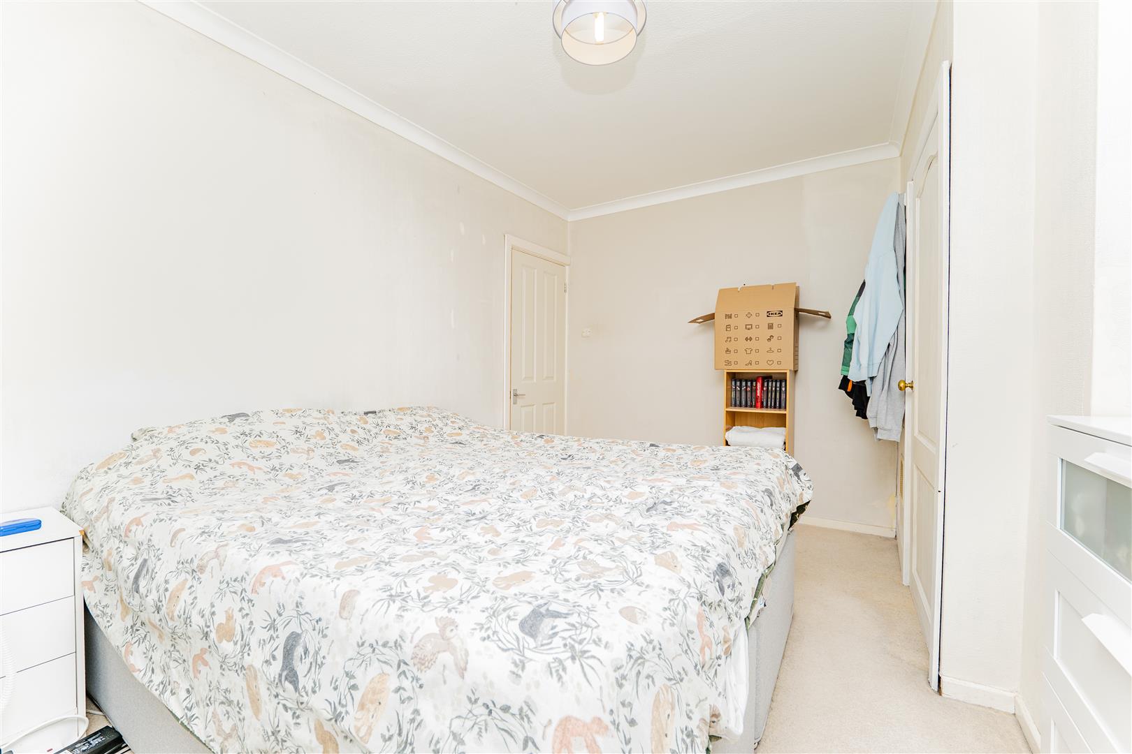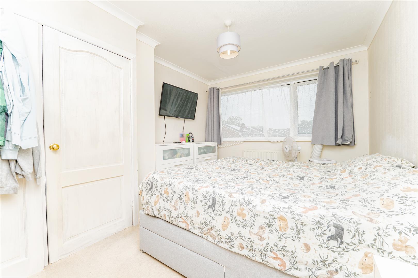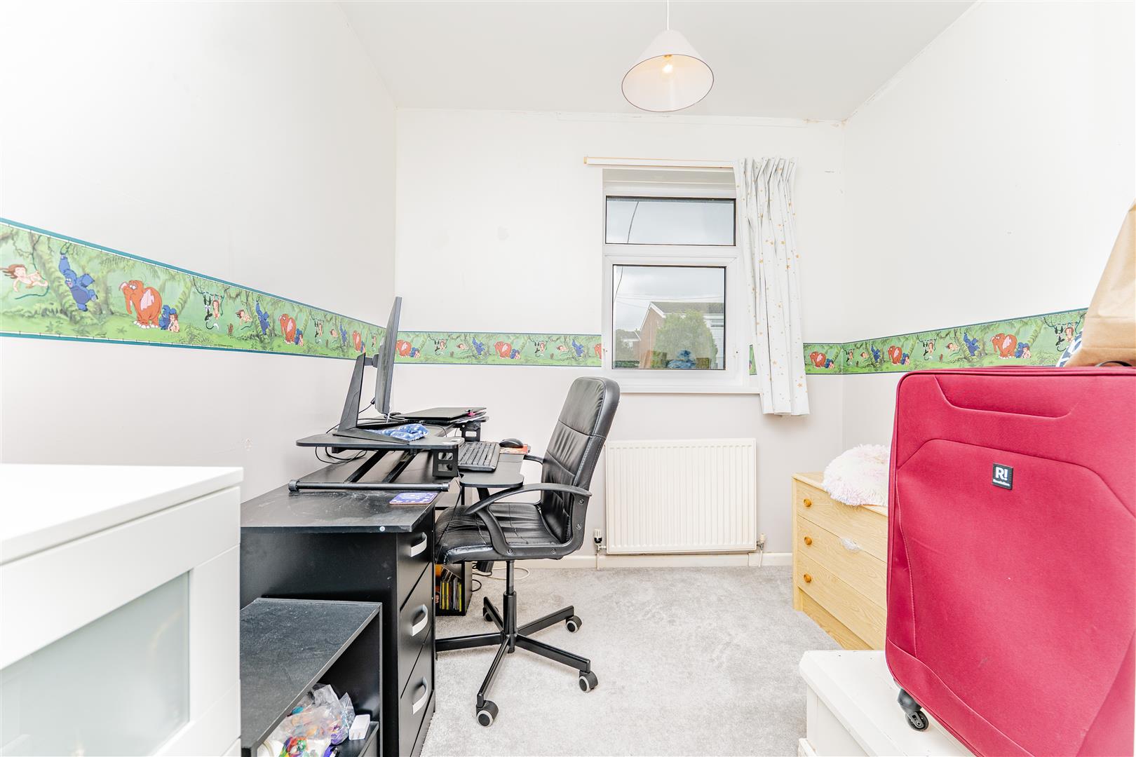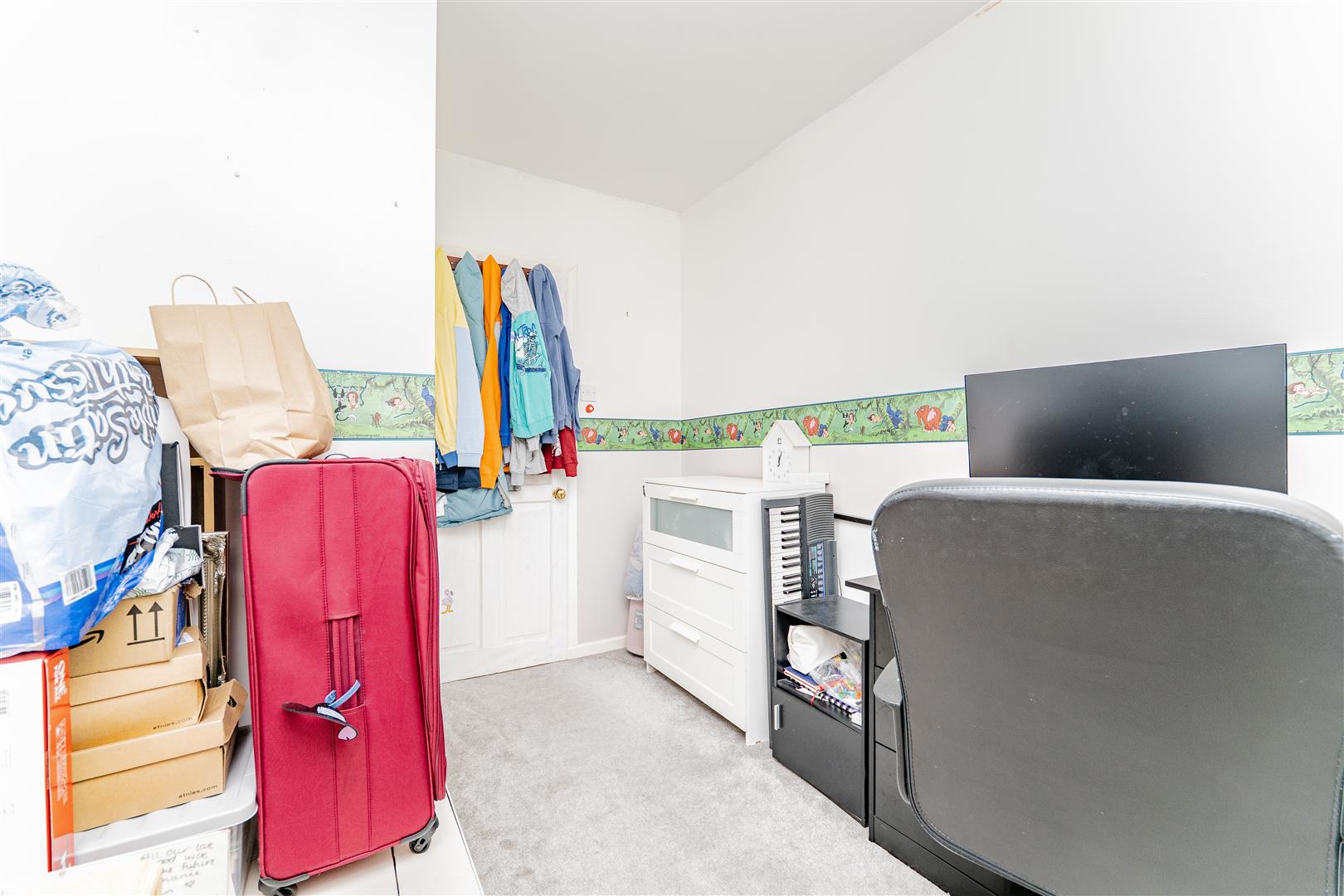 Upstairs, there are three spacious bedrooms. The main bedroom benefits from a built-in wardrobe, while the remaining rooms offer versatility for children, guests, or a home office. The family bathroom is finished with stylish floor-to-ceiling panelling and features a white suite comprising a toilet, sink, and bath with a shower over.