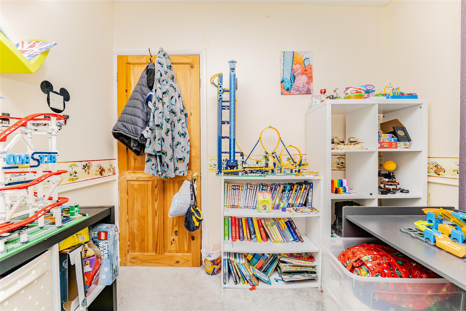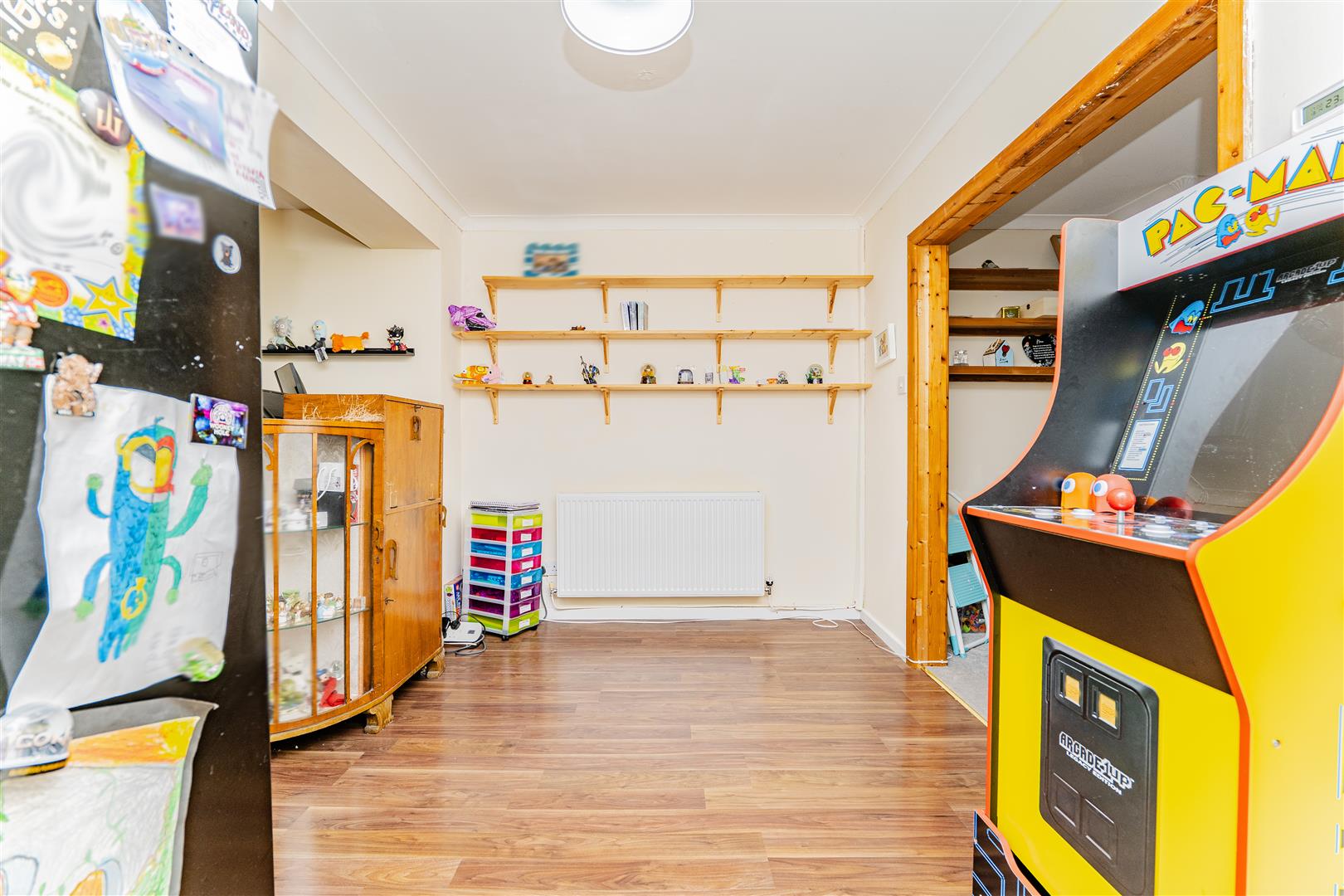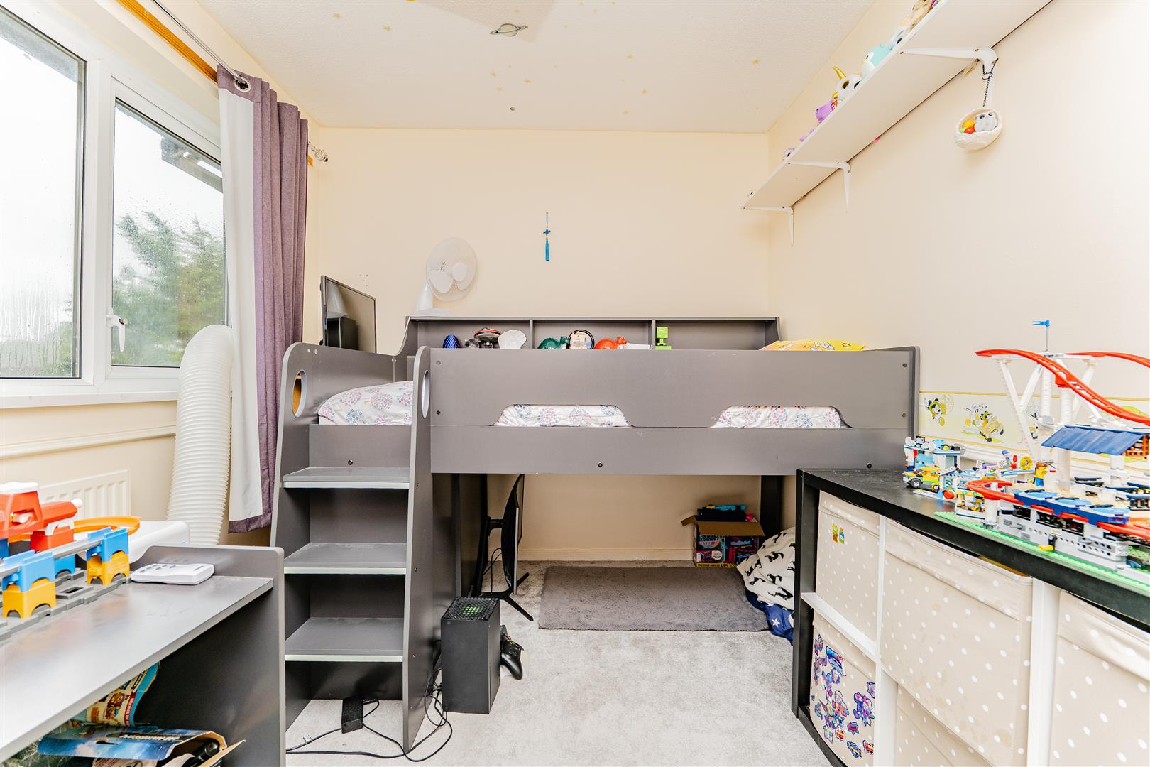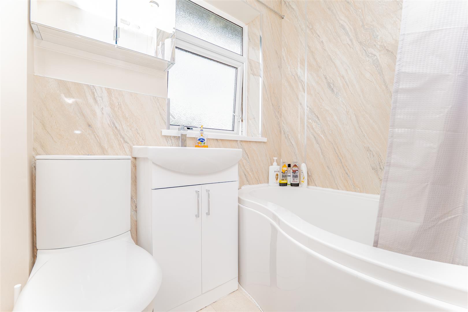 Upstairs, there are three spacious bedrooms. The main bedroom benefits from a built-in wardrobe, while the remaining rooms offer versatility for children, guests, or a home office. The family bathroom is finished with stylish floor-to-ceiling panelling and features a white suite comprising a toilet, sink, and bath with a shower over.
