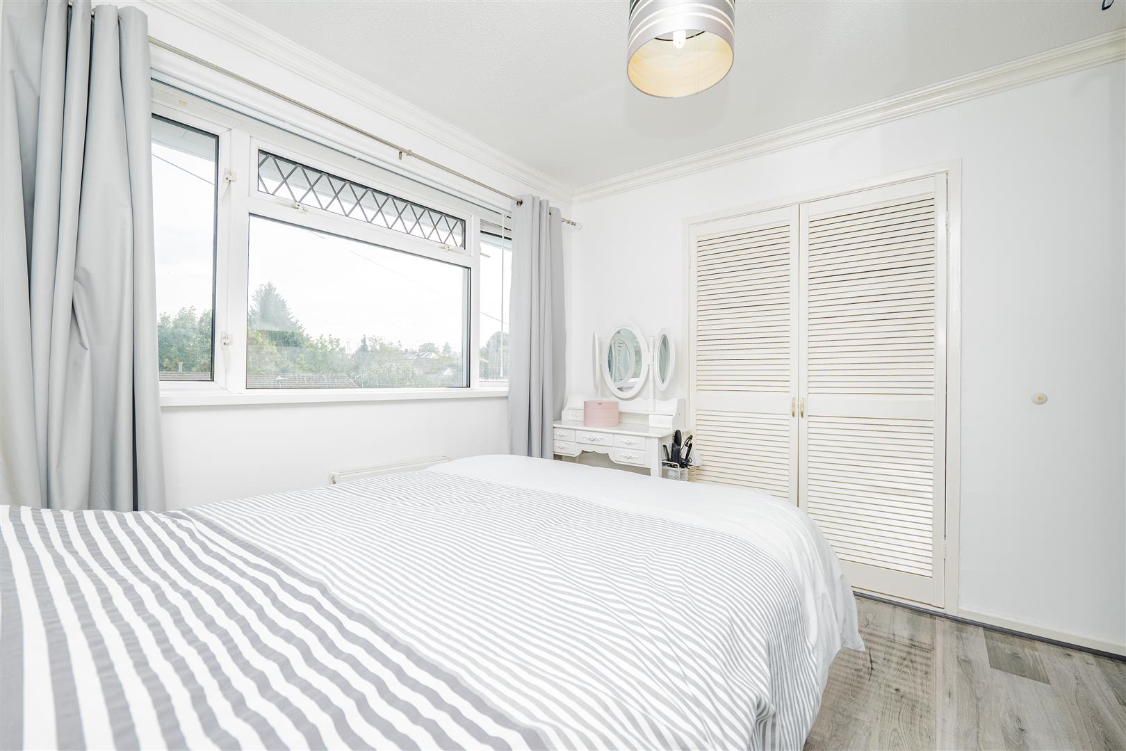 Upstairs, the property provides three well-proportioned bedrooms. The two larger bedrooms both include fitted cupboards, while the flooring throughout these rooms is finished with a modern grey wood-effect design. The family bathroom is stylish and contemporary, complete with a white suite, overhead shower, light wood-effect flooring, and white and grey marble-effect wall panels.