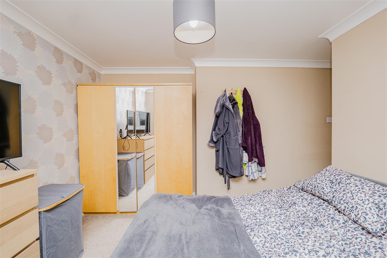 On the first floor, the property offers three spacious bedrooms, all finished with neutral décor and fitted carpets. The one-bedroom benefits from a built-in storage cupboard, with an additional storage cupboard in the hallway. The family bathroom is fitted with a bath and an overhead shower, a white WC, and a wash basin, providing a clean, functional space.