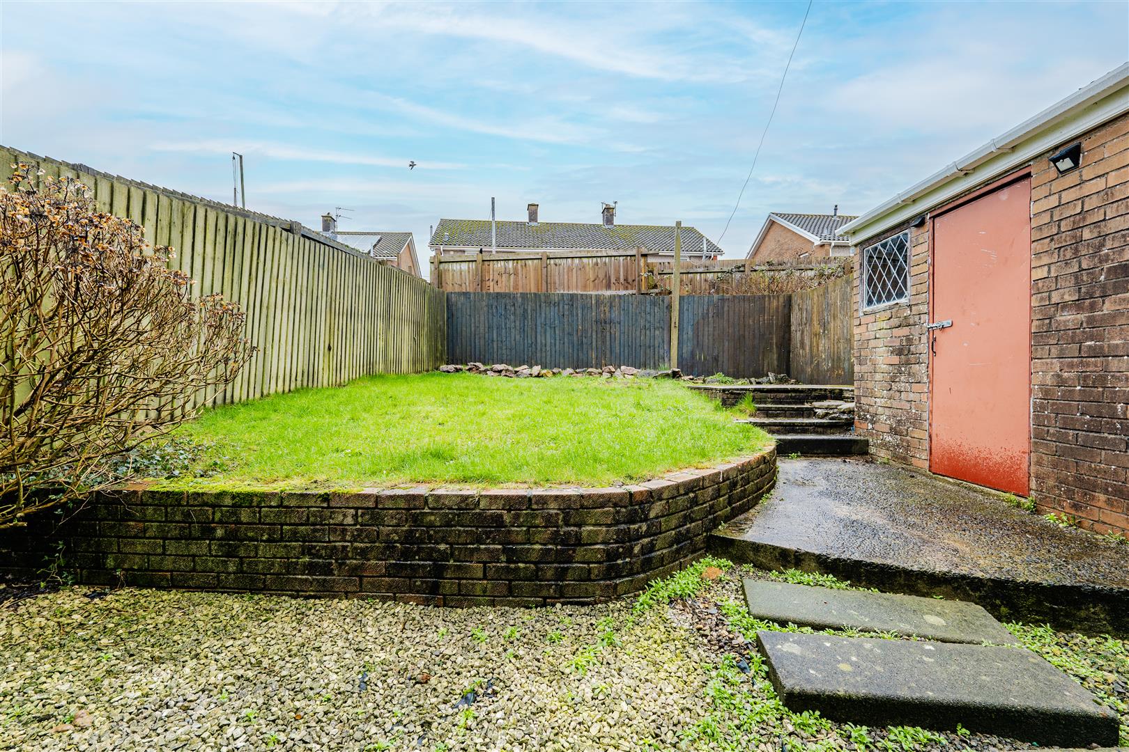 - Tiered rear garden with brick shed