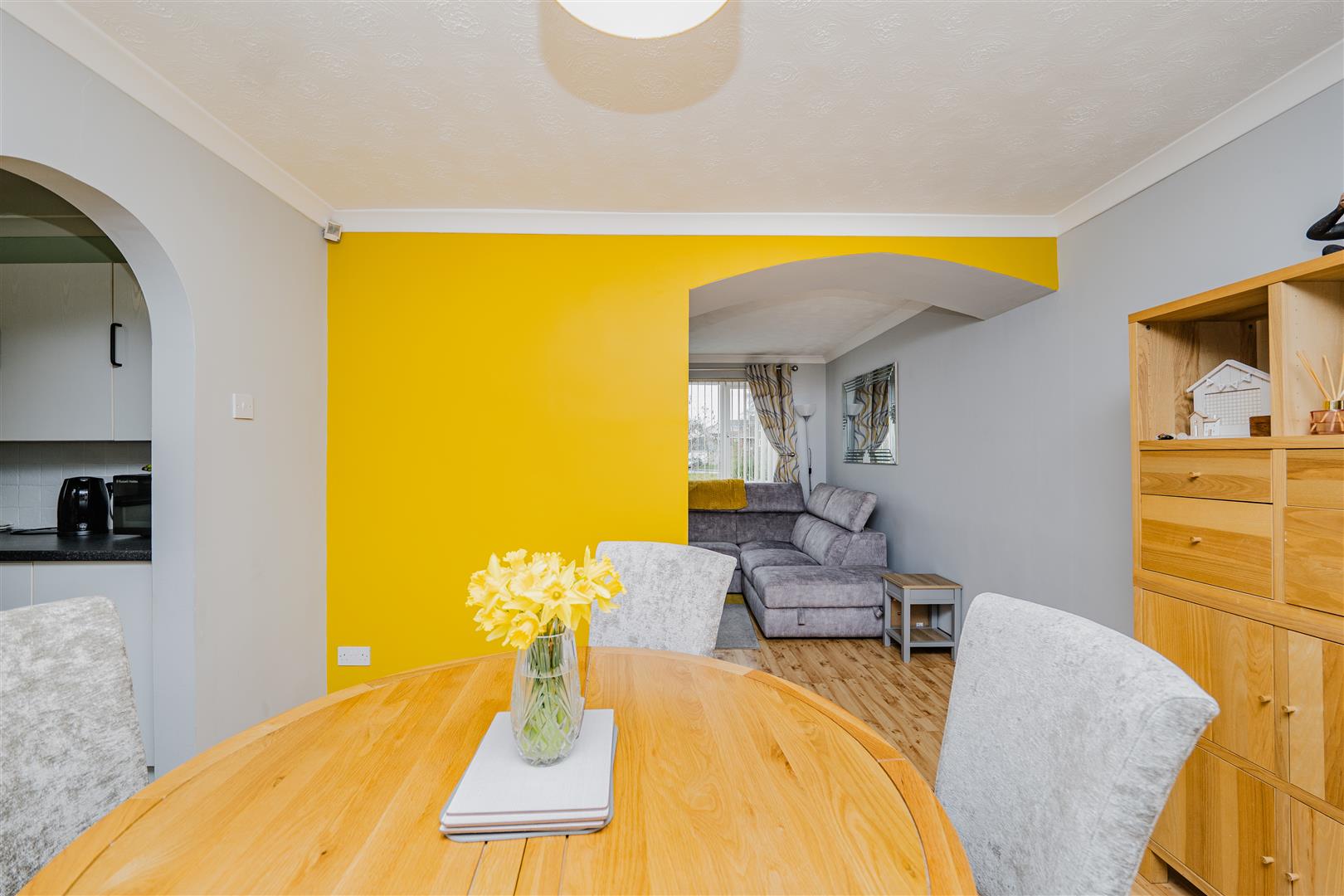 An archway opens into the dining room, which offers ample space for a family dining table and continues the wooden flooring theme. Patio doors provide direct access to the rear garden, enhancing indoor-outdoor living. A further archway leads through to the kitchen, which is a good size and well-equipped with plentiful cupboard and worktop space. The kitchen also offers convenient access to the garden side.