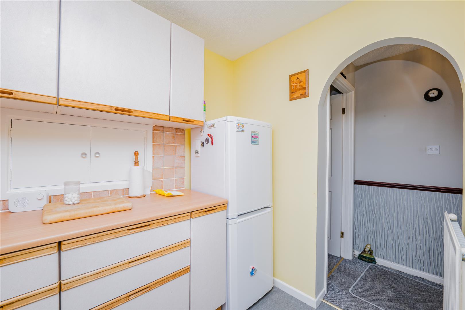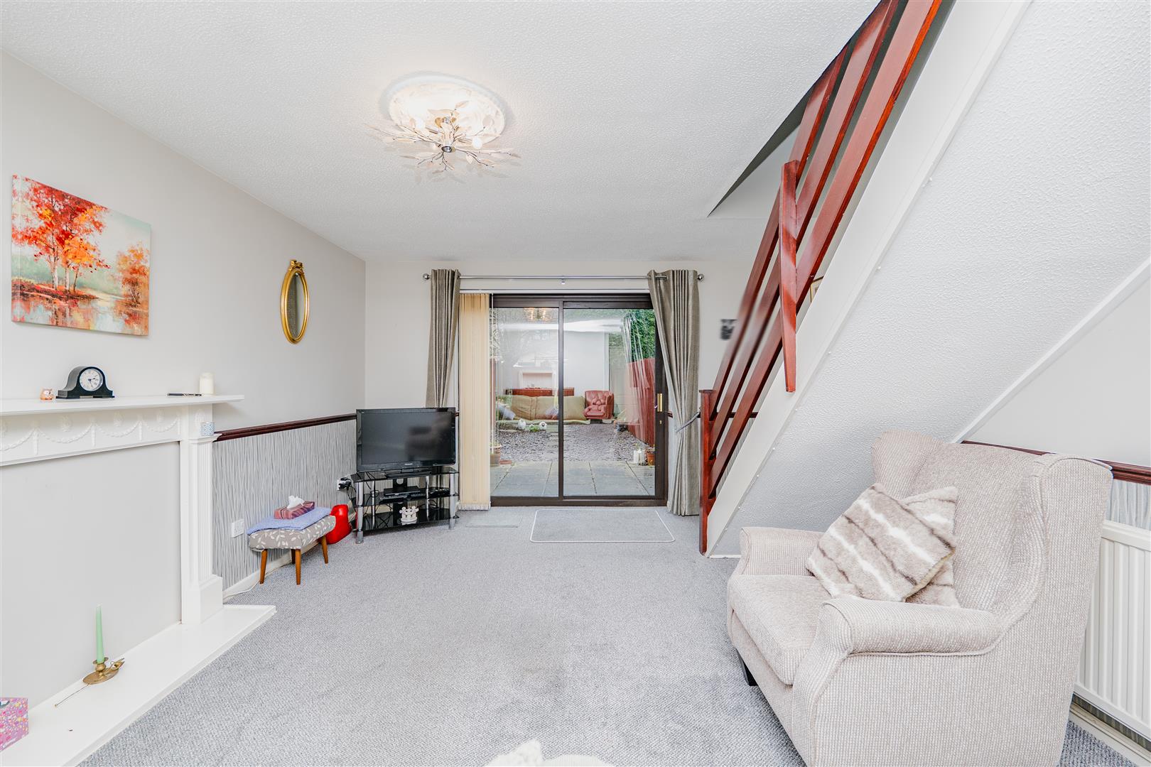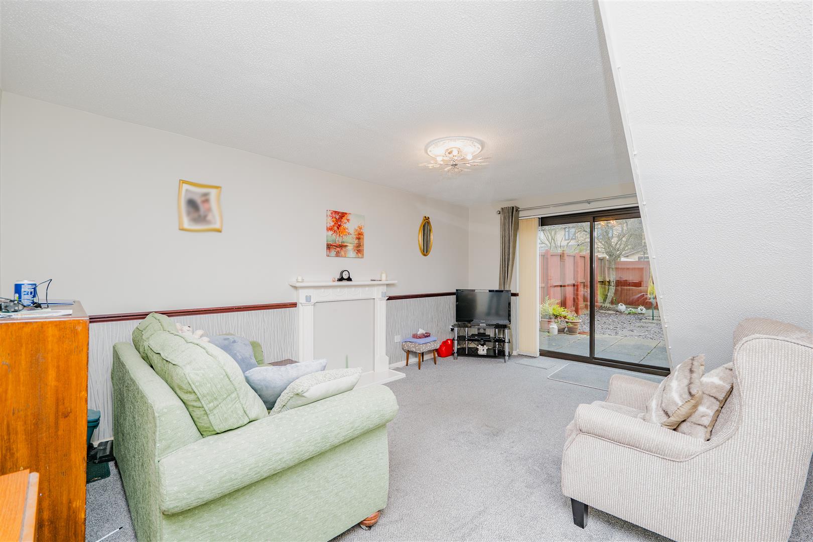 The kitchen features white cupboards with wooden-coloured trims, complemented by light wood worktops, creating a warm and inviting space for cooking and entertaining. Leading from the kitchen, the living/dining room is a fantastic size, with neutral walls and light grey carpeting throughout. Sliding doors provide direct access to the rear garden, flooding the room with natural light and offering seamless indoor-outdoor living.