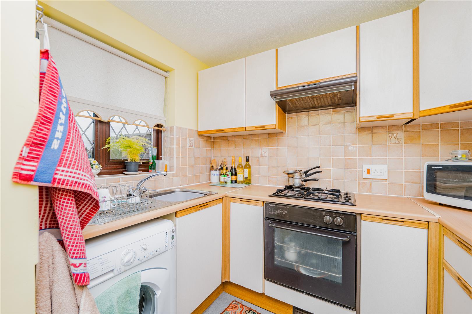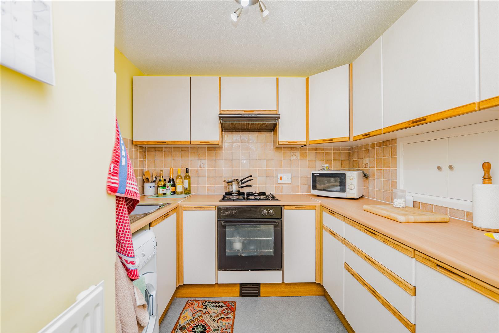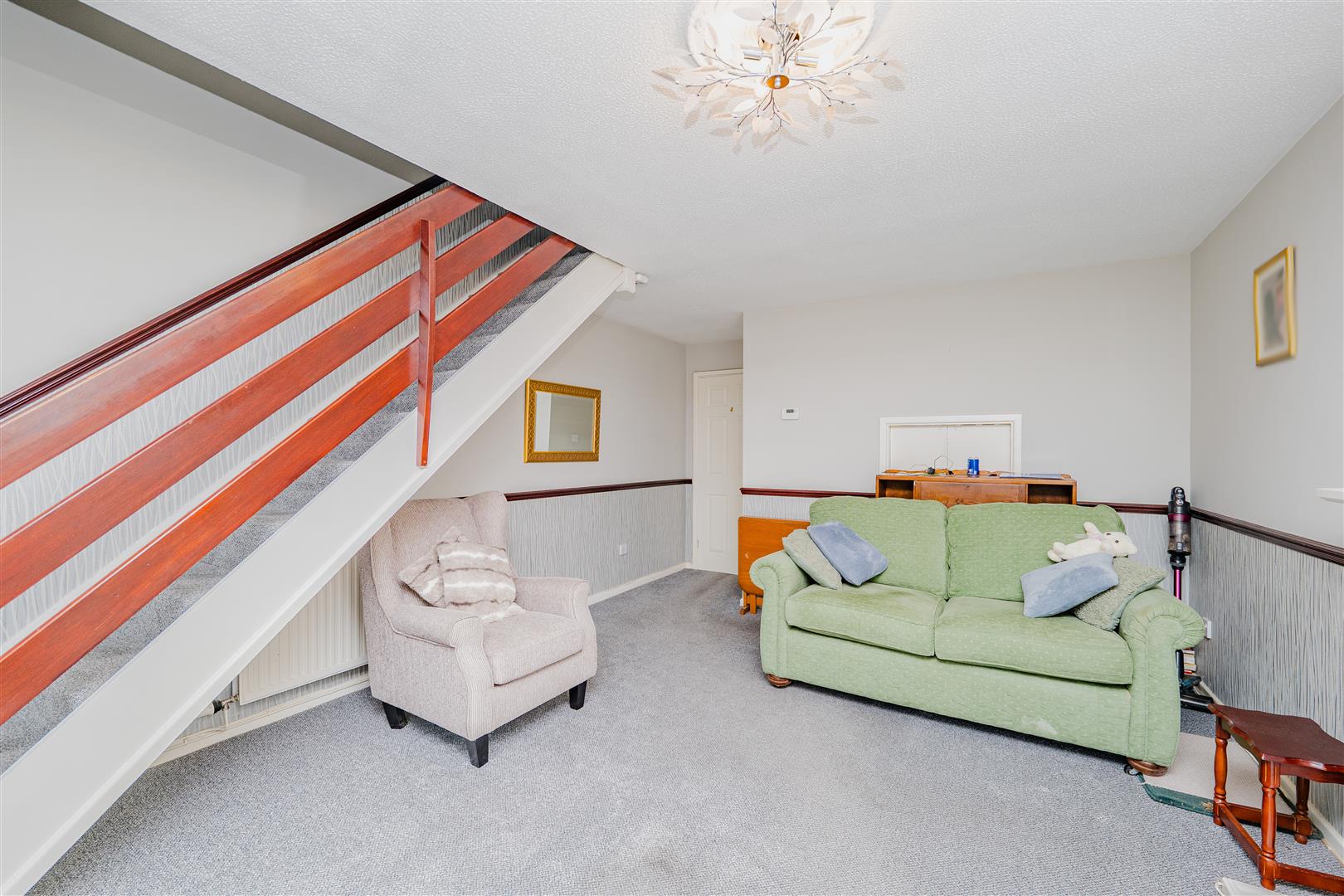 The kitchen features white cupboards with wooden-coloured trims, complemented by light wood worktops, creating a warm and inviting space for cooking and entertaining. Leading from the kitchen, the living/dining room is a fantastic size, with neutral walls and light grey carpeting throughout. Sliding doors provide direct access to the rear garden, flooding the room with natural light and offering seamless indoor-outdoor living.
