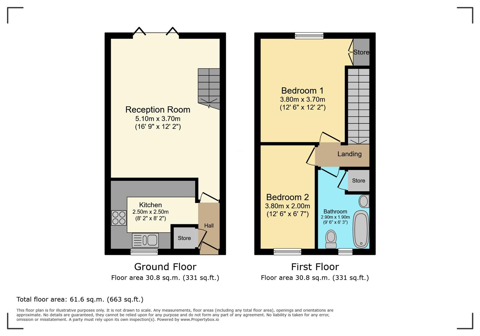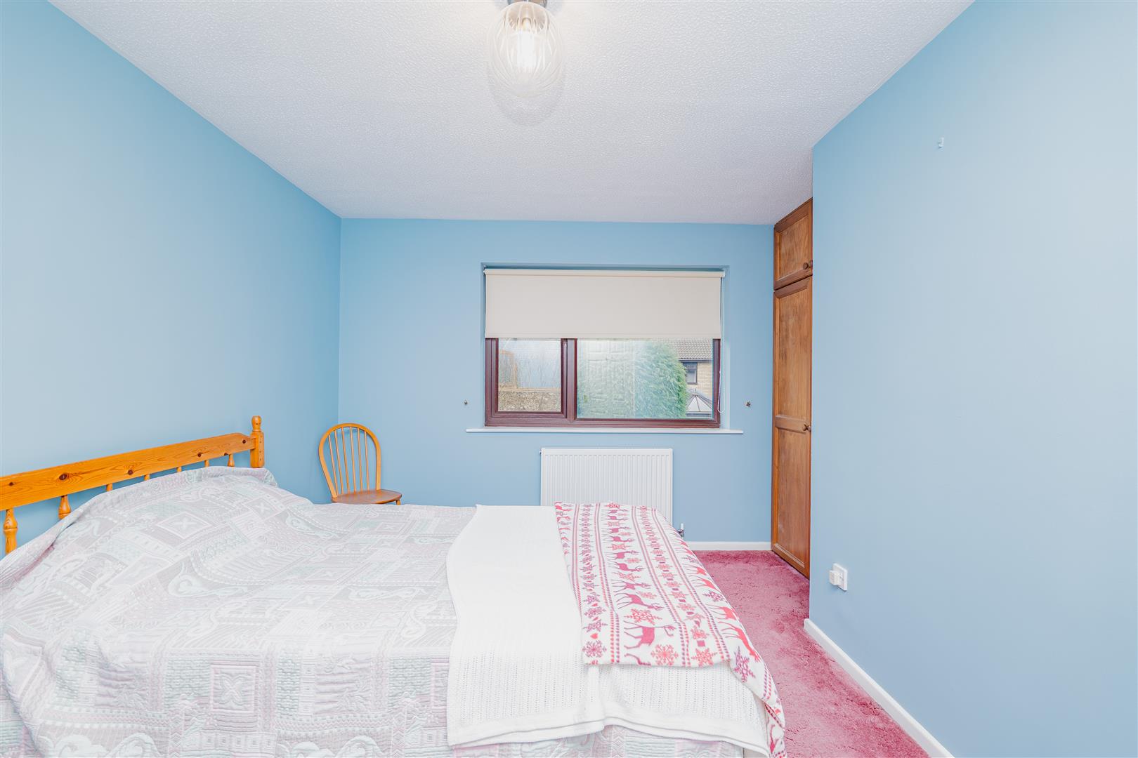 Upstairs, the property offers two generously proportioned bedrooms. The main bedroom features a built-in wardrobe for practical storage, while the second bedroom is also spacious and versatile. The family bathroom is fitted with a white suite, including a bath with an overhead shower, a sink, and a toilet, completing the first-floor accommodation.
